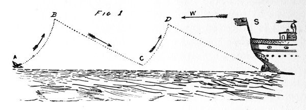 In Fig. 1, let S represent a steamship going eastward at the rate of twenty miles per hour; W the wind blowing westward at the rate of twenty miles per hour; A a gull near the water’s surface, with momentum which for the instant gives him an eastward velocity of twenty miles per hour. While the bird’s momentum lasts it holds him firmly against the wind. At the point A the bird inclines his wings so that the wind strikes them on the under side, and he is lifted and lifted until, at the point B, his momentum is so reduced that he must tack; then he gives to the wind the thin edge of his wings and slides down to the point C, and then, with velocity regained, he repeats the manœuvre. Altitude sacrificed becomes velocity or momentum, and momentum sacrificed becomes altitude. In this description of the gull’s soaring to windward, the movement is reduced to its simplest elements, and it leaves out of account the graceful sinuosity of the bird’s airy travels, just as the teacher of dancing leaves grace out of account when she teaches the beginner the elements of the steps.