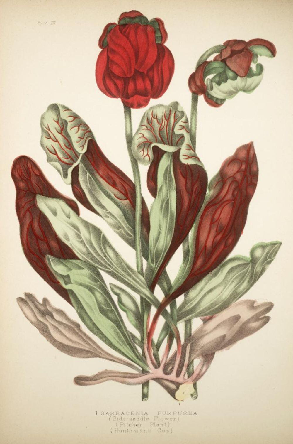 The tall stately flower of the Pitcher Plant is not less worthy of our attention than the curiously formed leaves. The smooth round simple scape rises from the centre of the plant to the height of 18 inches to 2 feet. The flower is single and terminal, composed of 5 sepals, with three little bracts; 5 blunt broad petals of a dull purplish-red colour, sometimes red and light-yellowish green; and in one variety the petals are mostly of a pale-green hue, and there is an absence of the crimson veins in the leafage. The petals are incurved or bent downwards towards the centre. The stamens are numerous. The ovary is 5-celled, and the style is expanded at the summit into a 5 angled, 5 rayed umbrella-like hood, which conceals beneath it 5 delicate rays, each terminating in a little hooked stigma. The capsule or seed vessel is 5-celled and 5-valved; seeds numerous.