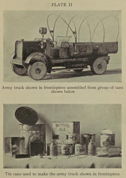 Aside from the pleasure derived from the actual making of tin can toys, perhaps the greatest[7] satisfaction lies in the fact that you are using material usually thrown away—making something out of nothing.
