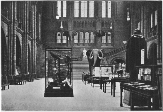 On entering the hall the visitor will notice the bronze statue of the late Sir Richard Owen, K.C.B., Superintendent of the Natural History Departments of the British Museum (1856–1884). It is the work of Mr. T. Brock, R.A., and was placed in the Museum on March 17th, 1897. To the right of this is a marble statue of the late Professor T. H. Huxley, sculptured by Mr. E. Onslow Ford, R.A., which was unveiled on April 28th, 1900. In the first bay on the left is a bust, by Mr. Brock, of the late Sir W. H. Flower, Director of the Natural History Departments of the British Museum from 1884 to 1898. Most of the cases placed on the floor of the hall illustrate general laws or points of interest in natural history which do not come appropriately for illustration within the systematic collections of the departmental series.