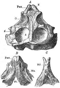 At the eastern end of the gallery are the Pterosauria or Ornithosauria, commonly called Pterodactyles or Flying Reptiles. Their most gigantic representatives were the species of Pteranodon from the Upper Cretaceous of Kansas (fig. 53). At the west end is the nearly complete skeleton of Pariasaurus (fig. 52) from the Karoo formation (Trias) of South Africa. It occurs also in Russia, and belongs to a primitive section of the Theromorphs, or Anomodonts, which include the ancestors of Mammals.
