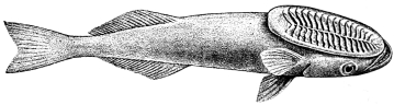 Of the galleries running northwards from the Fossil Reptile gallery, the one nearest to the central hall is used for the display of the Fossil Fishes, many belonging to groups now extinct. Perhaps the most remarkable of all, and certainly most unlike existing forms, are the armoured Devonian Fishes known as Cephalaspis, Pterichthys (fig. 54), etc. The well-preserved fishes from the Chalk are especially noteworthy, and a specimen of Portheus in a central case, 14 feet in length, is one of the largest bony fishes known.