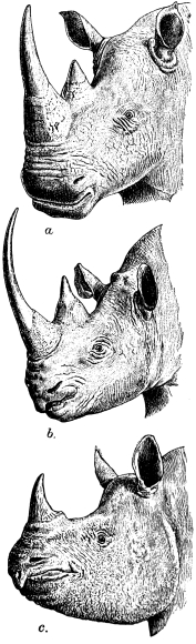 76 The next central case is occupied by the skulls and portions of jaws of a remarkable horned hoofed quadruped, Arsinoïtherium (fig. 42), from the Upper Eocene of the Fayum, Egypt. It belongs to an ancient group not closely related to any living animal.
