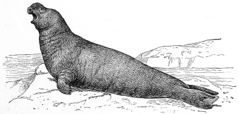 Near the pavilion is a skeleton (fig. 45) of an interesting animal, the Northern Sea-Cow (Rhytina gigas or stelleri), the last resort of which was Bering Island in the North Pacific, where it was completely exterminated towards the close of the eighteenth century. In the same case is placed the skeleton of a smaller allied animal, the Halitherium, from the Oligocene of79 South Germany. These, with their existing representatives, the Manatee and Dugong, constitute the order Sirenia, aquatic Mammals of fish-like form, presenting considerable external resemblance to Cetacea (Whales and Dolphins), but differing in many points of structure and habit. All the exhibited specimens of the group, both living and extinct, are shown in this gallery.