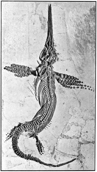 The long corridor north of the fossil Mammal-gallery contains a fine assemblage of Reptilian remains. The south side is devoted to the Great Sea-Lizards (Sauropterygia and Ichthyopterygia), mostly from the Lias formation. The skeleton of an Ichthyosaur from the Lias is shown in fig. 50. Skeletons of Plesiosaurians and Pliosaurians from the Oxford Clay are mounted in central cases. Ranged in the cases on the north side are remains of the gigantic Dinosaurs, which vastly exceeded in size any other land-animals. A mounted plaster cast of a complete skeleton of the Iguanodon (fig. 49), found (with many others) in the Wealden strata at Bernissart in Belgium, is exhibited in the gallery of recent Reptiles; but a large series of bones of the same reptile is shown here.