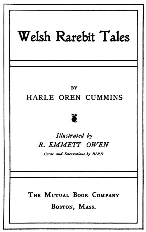 The Project Gutenberg EBook of Welsh Rarebit Tales, by Harle Oren Cummins This eBook is for the use of anyone anywhere in the United States and most other parts of the world at no cost and with almost no restrictions whatsoever. You may copy it, give it away or re-use it under the terms of the Project Gutenberg License included with this eBook or online at www.gutenberg.org. If you are not located in the United States, you'll have to check the laws of the country where you are located before using this ebook. Title: Welsh Rarebit Tales Author: Harle Oren Cummins Illustrator: R. Emmett Owen Release Date: September 14, 2019 [EBook #60294] Language: English Character set encoding: ISO-8859-1 *** START OF THIS PROJECT GUTENBERG EBOOK WELSH RAREBIT TALES *** Produced by Tim Lindell, David E. Brown, and the Online Distributed Proofreading Team at http://www.pgdp.net (This book was produced from images made available by the HathiTrust Digital Library.)