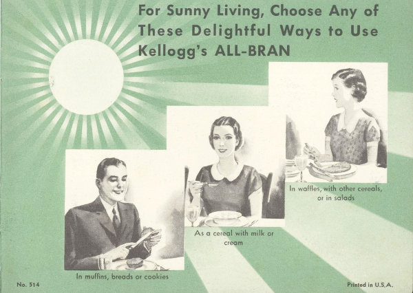 Perhaps the meals you serve are “bulk-minus” meals. Kellogg’s All-Bran is the “bulk-plus” food so necessary in the well-balanced diet. Serve as a cereal, combined with other cereals, or use it as an ingredient in many tempting and economical dishes. ★ All the recipes in this helpful folder have been triple tested in our Cottage Kitchen so that you may get the fullest enjoyment from the use of All-Bran in your home. ★ Laboratory tests show (1) that All-Bran is a safe and gentle food that relieves constipation due to insufficient “bulk”; (2) that it does not lose its effectiveness with continued use; (3) that it is a good source of iron and Vitamin B. ★ Kellogg’s All-Bran is accepted by the American Medical Association Committee on Foods as a natural laxative food for normal people.