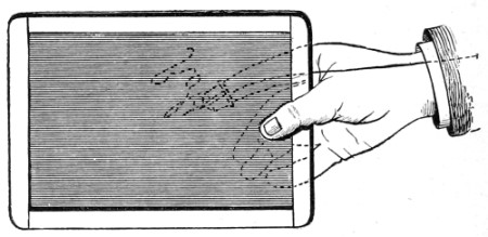 Still another idea in a single slate is as follows: An ordinary looking slate is given out for examination, and, on its being returned to the medium, he takes his handkerchief and cleans or brushes both sides of the slate with it; and, upon again showing that side of the slate first cleaned, it is found covered with writing apparently done with chalk. The following is the simple explanation of it: Take a small camel’s hair brush and dip it in urine or onion juice, and with it write or trace on the slate whatever you desire, and when it becomes[8] dry, or nearly so, the slate can be given for examination without fear of detection. The handkerchief the performer uses to clean the slate with is lightly sprinkled with powdered chalk. He makes believe to clean the one side devoid of preparation, but the side containing the invisible writing is gently rubbed with the handkerchief, not too hard just enough to let the powdered chalk fall on the urine or onion juice, where it leaves a mark not unlike a chalk mark.