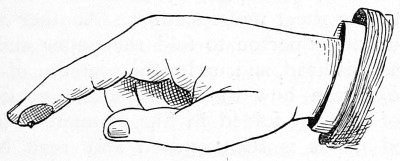 First we will begin with the single slate which has just been handed to the medium, after being thoroughly cleaned by the person bringing it. The skeptic holds one end of the slate in one hand and the medium the opposite end in one of his hands, and both persons clasp their disengaged hands. In a short time the slate is turned over and a few words written in a scrawling style are found. I must acknowledge that when I first witnessed this test it somewhat staggered me, but afterward, on seeing it the second time, I was enabled to fathom its mystery. It is patterned somewhat after the style claimed to have been used by Slade, wherein he used a piece of slate pencil fastened to a thimble, and with apparatus attached to his forefinger of the same hand holding the slate he did the writing. The thimble (Fig. 6) was fastened to an elastic which pulled the thimble out of sight up the sleeve or under the coat when it was done with. But it always required a little scheming and maneuvering both to use and conceal the device and get rid of it, and there was[19] always the fear of being detected with this bit of machinery about the person; so someone of an ingenious turn of mind hit upon another method. There are some slate pencils made the same as lead pencils, that is, a very small piece of slate pencil, about the size of a match, is enclosed in the wood after the manner of lead pencils. A tiny piece of this pencil is placed at the tip of the forefinger and over it is placed a piece of flesh-colored court plaster well fastened to the finger (Fig. 7) and well blended in with aniline dye with the finger, so both are exactly the same color. After everything becomes dry and hard a little hole is made in the court plaster, so as to allow the point of the piece of pencil to come through enough to mark on the slate. The finger thus prepared is what does the writing. The message or name must be written backward, so that when the slate is reversed it will appear in its correct position. To learn to do this quickly, stand in front of a looking-glass with the slate in your hand and watch your writing in the glass as you go along. You do not need to hold the slate underneath the table in this test; hold it in the air with a handkerchief over it, so as to disguise the movement of the[20] finger. The message must necessarily be short, on account of the radius through which the medium’s finger can travel.