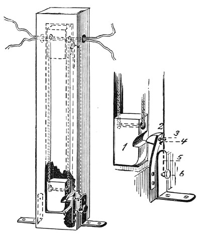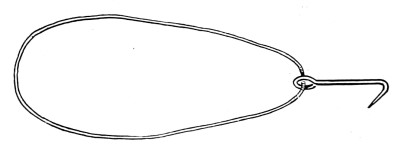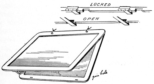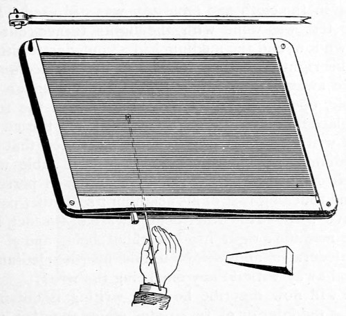 Now, suppose two slates are brought that are riveted or screwed or sealed at the four corners. How can writing be obtained upon them without disturbing any of the above arrangements? The slates are held under the table in the same manner as in previous tests. To produce the writing upon the slates the medium is provided with a few simple, though effective devices, one of which is a little hard wood tapering wedge, and a piece of thin steel wire, to one end of which is fastened a tiny piece of slate pencil. An old umbrella rib will be found to work admirably, because there is a small clasp at one end and at its other end a small eye. The pencil is made to fit into the end with the clasp. Now take the wooden wedge and push it between the wooden frames of the slates at the sides. The frames and slates will give enough to allow the wire and pencil to be inserted and the writing be accomplished with it, after which the wire is withdrawn, and then also the wooden wedge, and all is done without leaving any trace or mark behind as to how it is all performed. (Fig. 8.)