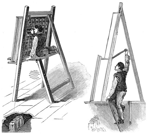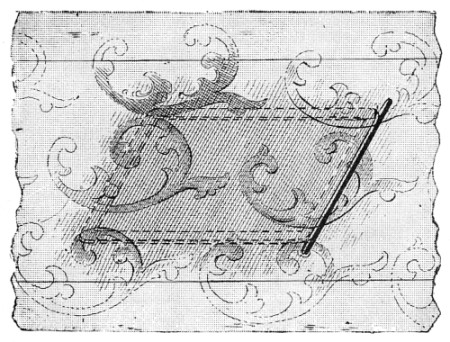 The explanation is as follows: The floor was covered with carpet. In this there was a slit or cut just large enough to pass or draw a slate through. A slate with writing on one side is previously placed under the carpet, with that side down. (Fig. 11.) The slates, as they are cleaned, are laid on the carpet[30] immediately over or near this concealed one, and, on lifting the slates from the floor, this one is also carried with them, and all placed on the table.