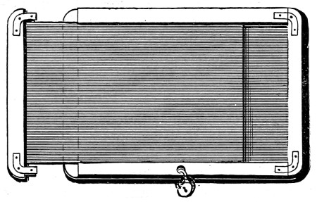 There is still another slate on which we can make[6] the writing appear suddenly. It is composed of a wooden frame, such as all wooden-edged slates have, but the slate itself is a sham. It is a piece of cloth painted with a kind of paint known as liquid, or silicate slating, which, when dry and hard, is similar to[7] the real article. This cloth is twice the length of the slate and just the exact width. The two ends of the cloth are united with cement, so as to make an endless piece or loop. There is a small rod or roller in both the top and bottom pieces of the frame, the ends being made hollow to receive them. Over these rollers runs the cloth, stretched firmly and tightly. Just where the cloth is joined or cemented is a little black button, or stud of hard rubber or leather. This allows the cloth to be pushed up and down, bringing the back to the front; and by doing so quickly, the writing which is written on the cloth at the rear of the frame is made to come to the front in plain view. (Fig. 3.)