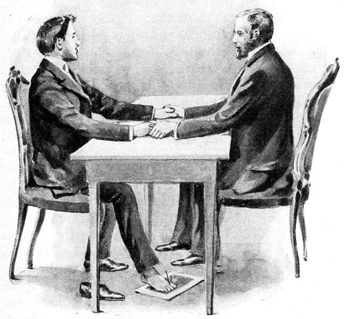 I wish to remark that, if any person tells you he took two slates of his own to a medium, thoroughly well tied or sealed, and that the slates never left his (the skeptic’s) hands, and that there was writing obtained upon the interior surface of the slates under those conditions, he was sadly mistaken, and has failed to keep track of everything that actually took place at the time of the sitting. Suppose two slates tied together are brought to the medium. Both he and the stranger sit at a table. The slates are held under the table, the medium grasping one corner and the skeptic the opposite corner, each with one hand, and the disengaged hands clasped together above the table. After a while the slates are laid upon the table, the string untied, the slates taken apart, but no writing is found. The medium states it must have been because there was no slate pencil between them. So a small piece of pencil is placed between the slates, and again they are tied with the cord by the medium, and he again passes them under the table, both persons holding the slates as before. Presently writing is heard, and, upon the skeptic bringing the slates from under the table and untying the cord himself, he finds one of the slates covered with writing, although but shortly[23] before they were devoid of even a scratch. Here is the explanation: The medium does not pass the slates under the table the first time, but drops them in his lap, with the side on which the string is tied or knotted downward, and really passes a set of his own for the skeptic to hold; he (the medium) supporting his end by pressing against the table with his knee, which leaves his hand disengaged. There is a slate pencil, called the soapstone pencil, which is softer than the ordinary. This is the one used by the medium. He now covers the face of the slate which is uppermost in his lap with writing, doing so very quietly and without any noise. Now, as he brings the slates above the table, he leaves his own in his lap and brings up the skeptic’s with the writing side down. The slates are untied and taken apart and shown, devoid of writing upon the inside, which he claims was caused by not having any slate pencil inside. The medium now places the pencil upon the slate which was originally the upper one, and covers this with what was the bottom slate, which is covered with the writing inside on the back or bottom of slate. This maneuver or action brings the slate on top with the writing upon its inside. Nothing could be more simple and natural. The slates are again tied together, and in doing so the slates are turned over, bringing the slate containing the writing, still upon the inside, at the bottom instead of the top, and the string tied or knotted above the top slate. Of course, when again separated, the writing is found upon the inside of the lower slate. When the slates are passed under the table the second time, the spectator himself is allowed to do this, and the medium, with one of his finger[24] nails, while holding his end of the slate, produces a scratching noise on the slate closely resembling the tracing of a pencil. It is not really necessary to pass the slates under the table the second time, but they can be held above it if preferred.