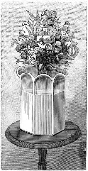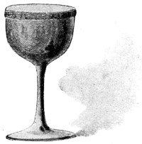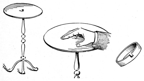It will not be out of place to describe a trick by which writing is produced upon an ordinary china plate by a somewhat similar means. The plate is examined and cleaned with a borrowed handkerchief, and then the performer requests the loan of a pinch of snuff, or uses a little sand or dust, which he places on the plate. He now commences to move the plate around in circles, and while doing so the snuff or sand is seen to gradually form itself into writing. The explanation is simple—whatever writing you desire to appear on the plate is placed beforehand on it. It is done with a camel’s hair brush dipped in the white of an egg and allowed to become dry before being handed around for inspection. As the performer cleans the plate he breathes on both sides of it, as if to give it moisture enough to help take off any dirt that might be thereon when rubbed with the handkerchief. In breathing on the front of the plate containing the writing done with the white of the egg, he moistens the writing enough to make the snuff or sand, as the case may be, adhere to it. Of course, in cleaning the front of the plate, care must be taken not to brush or disturb the invisible writing.