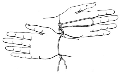 We now come to another style, wherein a slate is cleaned on both sides, and, while held in the hand facing the audience, becomes suddenly covered with writing, and the slate is immediately given for inspection. The writing is on the slate previous to the cleaning, and is hidden from view by a flap of slate colored silk, held firmly in place by a pellet of wax in each of the corners of the silk. Attached to this silk flap or covering (at the end that is nearest to the performer’s sleeve) is a stout cord or string, which is also made fast to a strap around the wrist of the hand opposite to that holding the slate. If the arms are now extended their full length, the piece of silk covering will leave the slate and pass rapidly up the sleeve out of the way, and thus leave the writing exposed to view. (Fig. 2.) The slate is found to be still a little damp from the cleaning with the sponge and water it had been given previously. This is easily accounted for. The water from the sponge penetrates just enough through the cloth to dampen the slate.