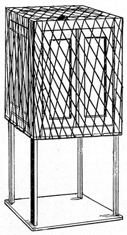 If the paper is to have a private mark put on it by an observer, so as to prove the writing really does appear on that identical piece of paper, the operation is varied as follows: The false flap is done away with, and the paper, which is furnished by the medium, has written on it the desired communication with ink, which is made visible and brought out black by means of heat. For the invisible ink you can use sulphuric acid, very much diluted, so as not to destroy the paper. The necessary heat is obtained in the following manner: The table (Fig. 4) on which[10] the slates are resting is hollow, and has concealed in it a spirit lamp filled with alcohol. This lamp sits directly under a trap in the table top, which is covered underneath for safety with sheet iron, so it will not catch fire. When the slates are placed on the table they are laid over the little trap door, which, in conjuring parlance, is known as a “trap.” This is now opened, and the slates allowed to become well heated and the trap then closed, and the prepared paper, upon coming in contact with the hot slate, is thus covered with writing.