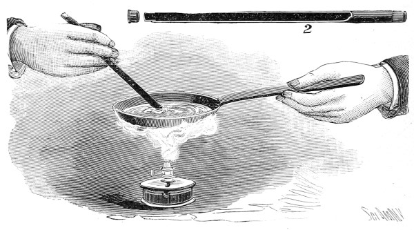 7. Write with a solution of sulphuric acid. The characters will appear in black through heat. This ink has the disadvantage of destroying the paper. (See the caution given on page 9.)