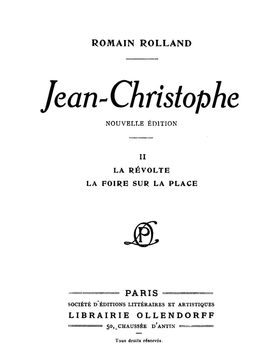 Project Gutenberg's Jean-Christophe Volume 2 (of 4), by Romain Rolland This eBook is for the use of anyone anywhere in the United States and most other parts of the world at no cost and with almost no restrictions whatsoever. You may copy it, give it away or re-use it under the terms of the Project Gutenberg License included with this eBook or online at www.gutenberg.org. If you are not located in the United States, you'll have to check the laws of the country where you are located before using this ebook. Title: Jean-Christophe Volume 2 (of 4) La Révolte, La Foire sur la Place Author: Romain Rolland Release Date: April 20, 2020 [EBook #61876] Language: French Character set encoding: UTF-8 *** START OF THIS PROJECT GUTENBERG EBOOK JEAN-CHRISTOPHE VOLUME 2 (OF 4) *** Produced by Laura Natal Rodrigues at Free Literature (Images generously made available by Hathi Trust.)