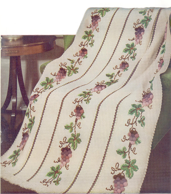 FRINGE—Wind yarn around a 5-inch cardboard, cut at one end. Matching colors, tie a 2 strand Fringe in every other st along top and bottom of Afghan.