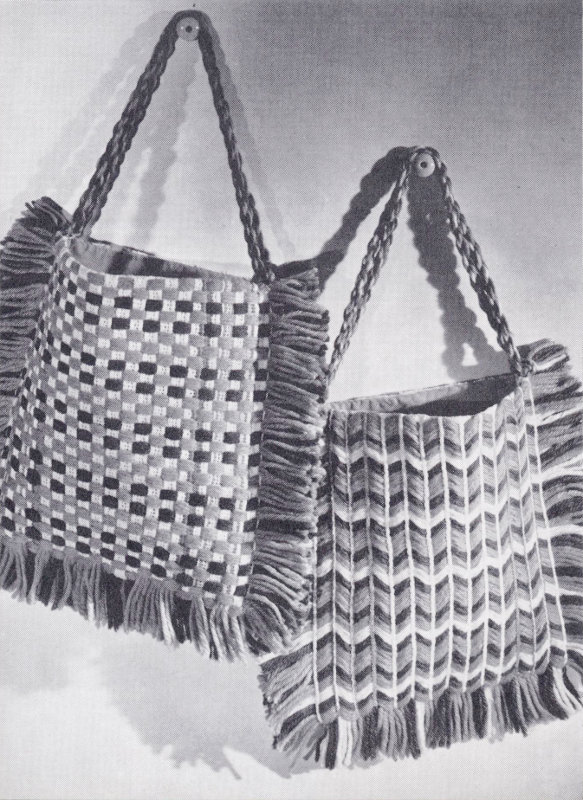 Cut strands of yarn about 25 inches long. Work in same manner as Woven Tote bag on page 23 but start weaving lengthwise of dish cloth at lower edge.