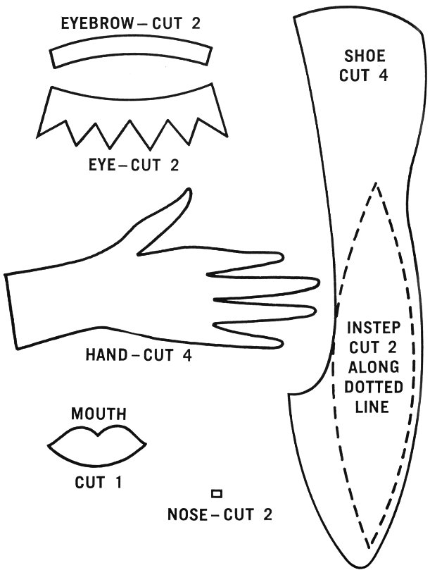 FACE: Cut eyelashes from Black felt same as Cat eyelashes on page 35. Cut mouth from Red felt about ⅛ inch larger than Doll mouth on page 34. Cut 2 White 1½ inch ovals for eyes. Cut two ½ inch circles of Navy felt and two ¼ inch circles Black felt for center of eyes. Cut 2 dots Red felt for nose. Glue in position as illustrated.