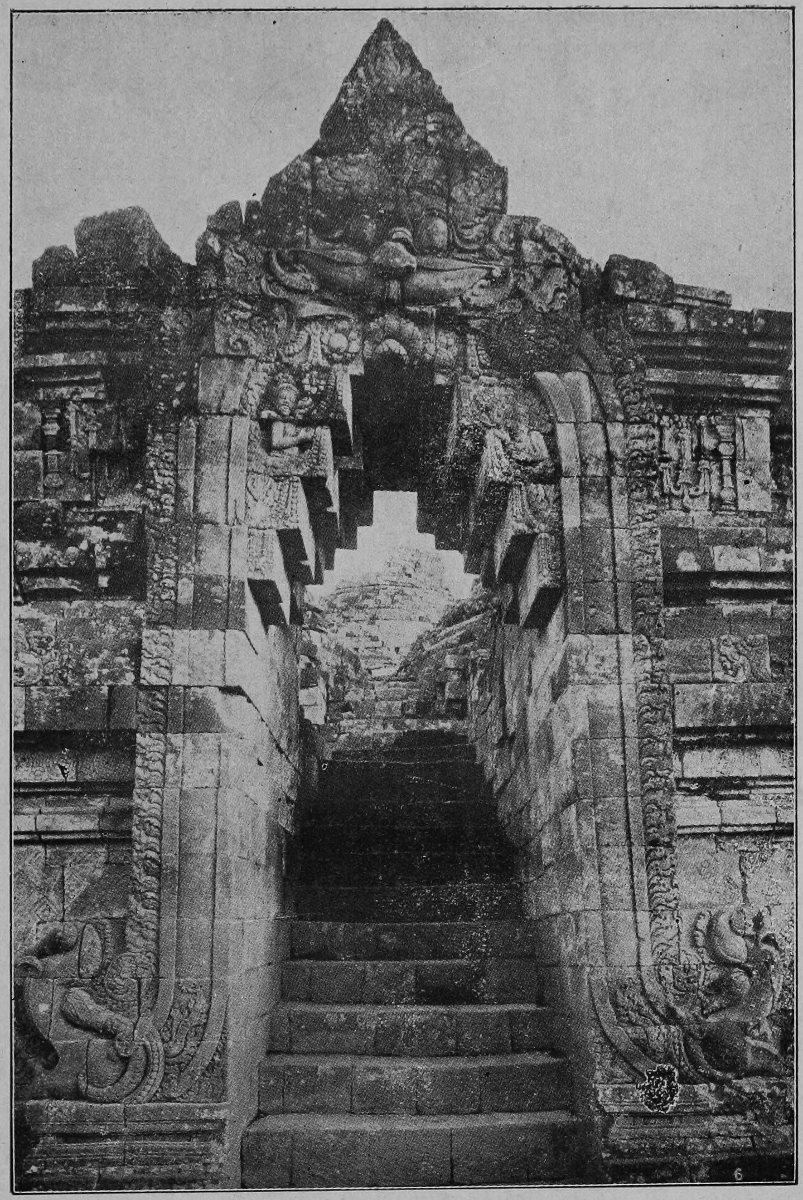 They were explained to us by the French Indian architect Henry Parmentier who spoke of analogical cases in Farther India [Bulletins de l’école française d’Extrême Orient][13]. Even there the temples closely related to the Hindu ruins in Java had no windows or openings outside the entrance which opened into an equally dark porch; and as it was very dark inside the walls were provided with niches for lamps to light the images throning in these sanctuaries.