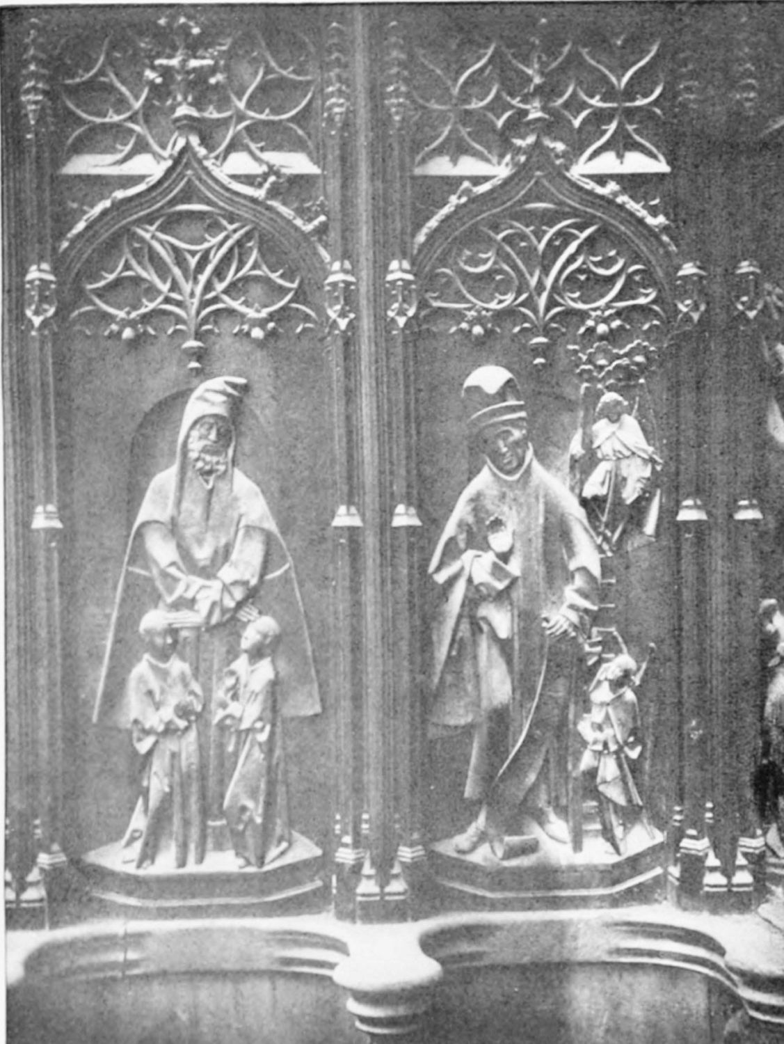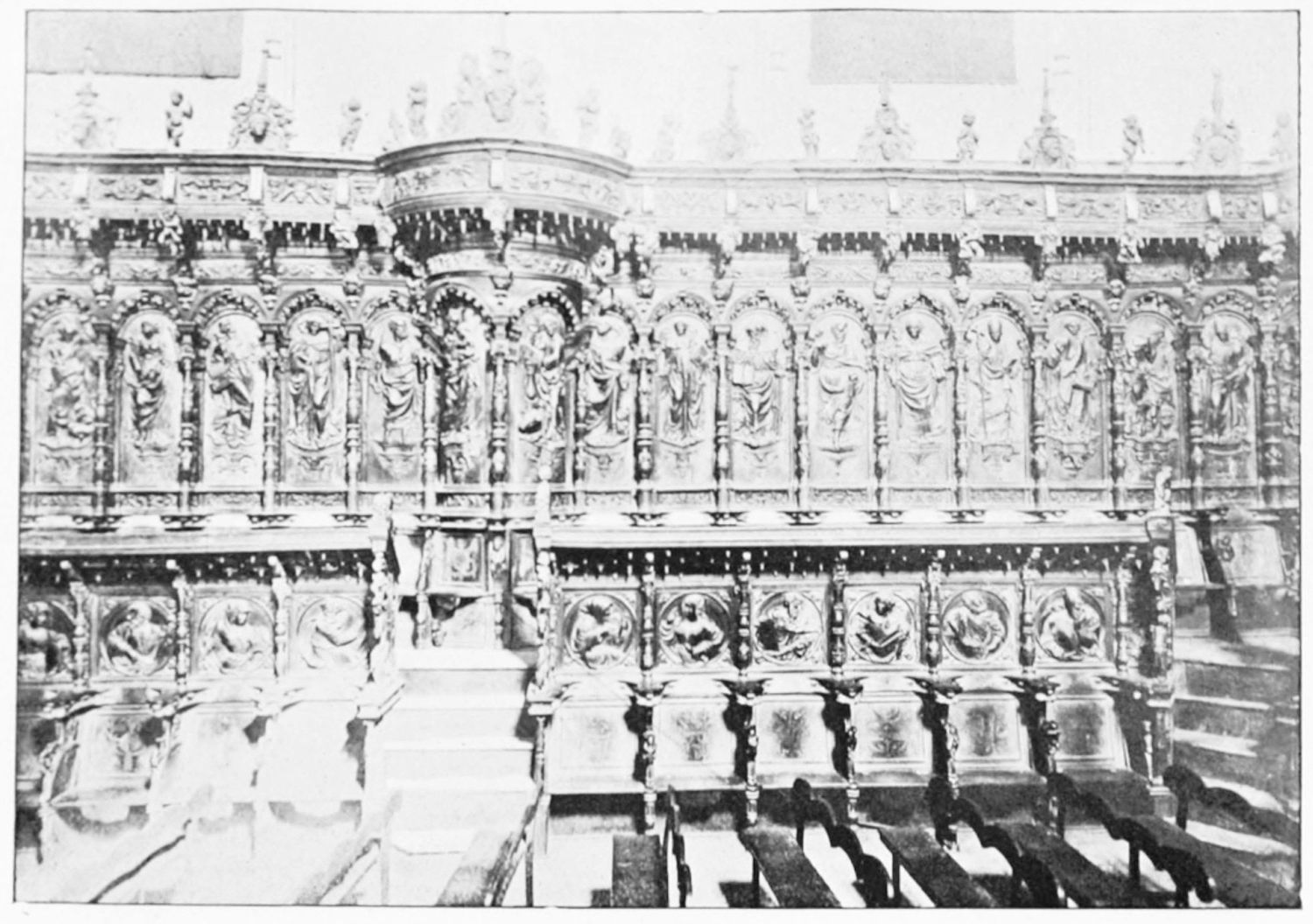The church is large and cruciform, with some good glass, windows with plateresque traceries, and fine arabesques. The most notable accessories are the choir stalls, the upper row exhibiting admirably carved busts of New Testament worthies; the lower row, of the saints of the Old Dispensation. Grotesque and capricious masks, centaurs, griffins, and so forth, are introduced in great profusion into the decoration; they were the work, for the most part, of one Doncel in 1542, and were mutilated by a pupil of Churri{27}guera in the early part of the eighteenth century.