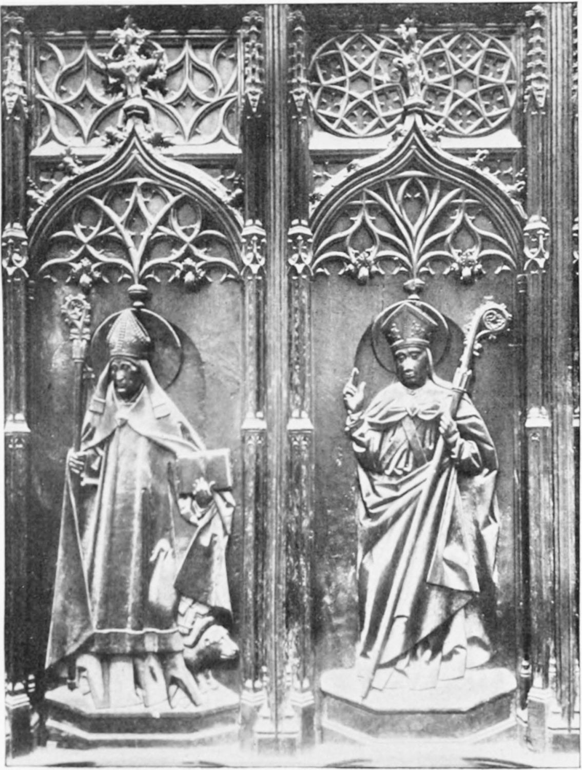The entrance to the south transept has been entirely rebuilt, but the original reliefs and{19} statuary of the three doors have been preserved and re-erected. Some old Byzantine capitals may be distinguished among the Gothic work. The south-west door is relieved with a diaper of fleurs-de-lys and castles, and lions and castles. The sculpture of the tympanum is equal to that of the west front, and shows the Saviour and the Evangelists, the twelve Apostles, and the Death of the Blessed Virgin. The colossal statue on the central shaft is that of San Froilan, an early bishop of Leon. Above is a row of four windows of two lights, and an enormous rose-window.