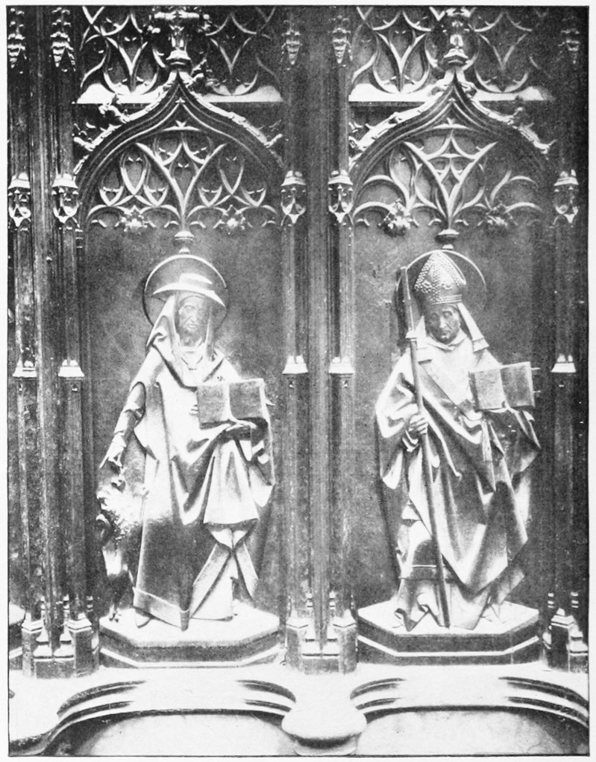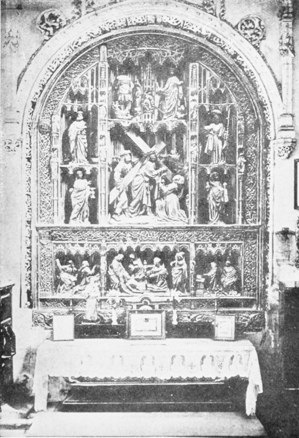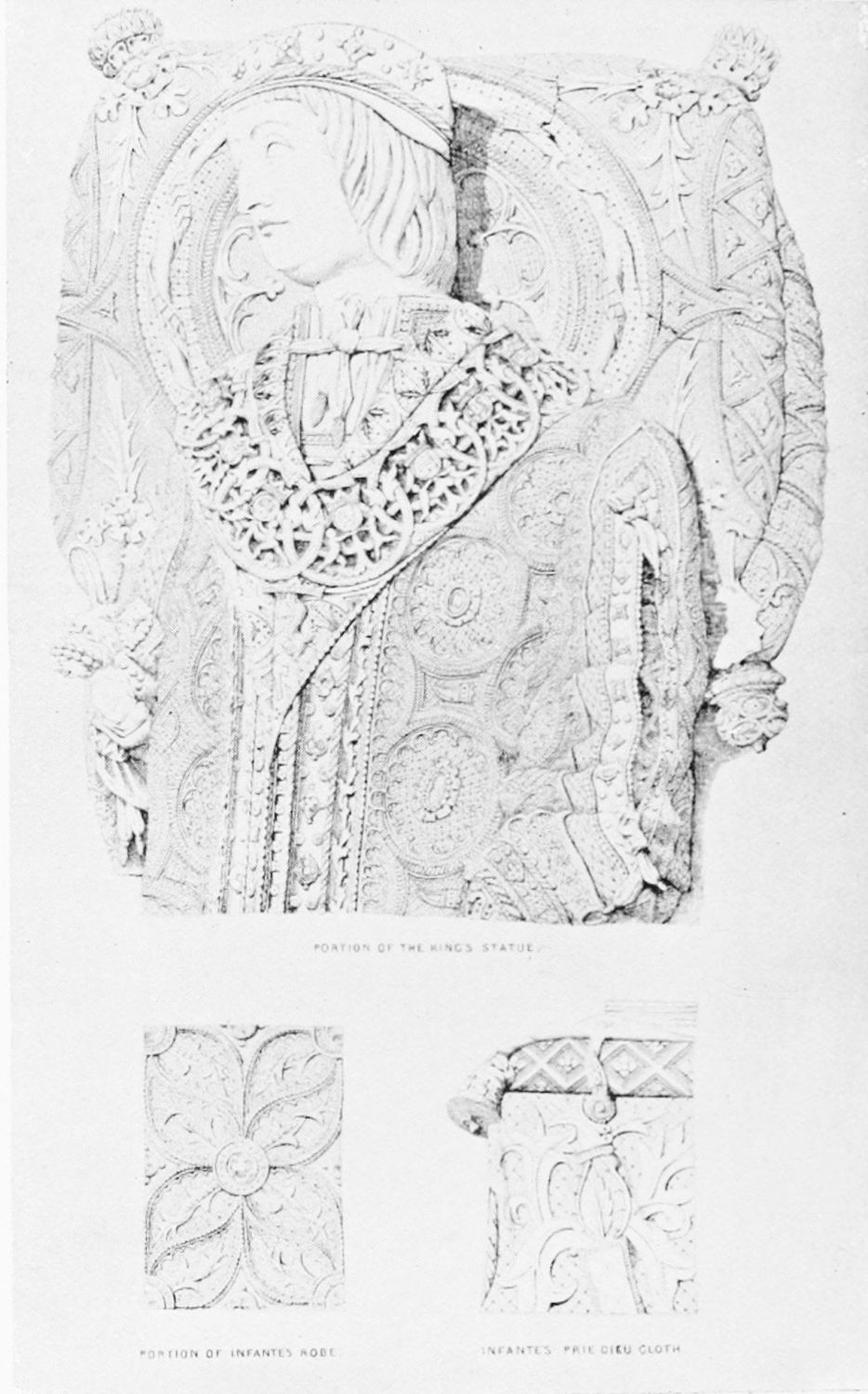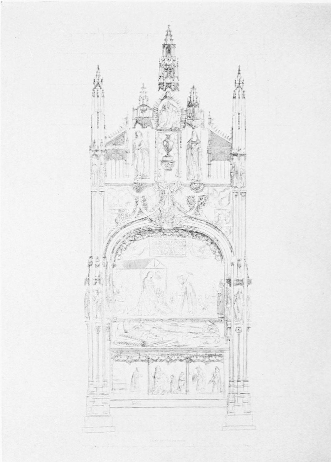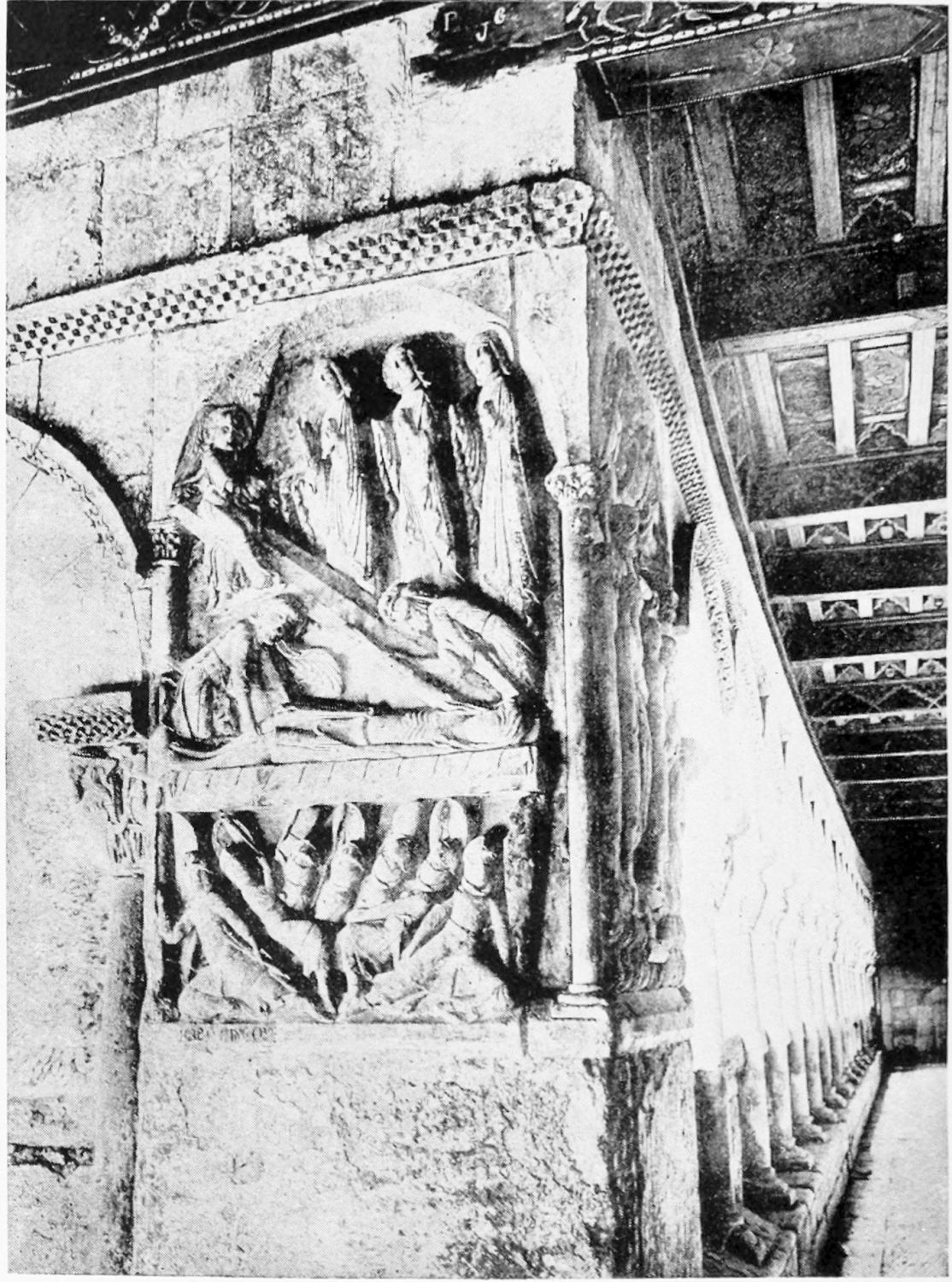 But after the general ensemble and the stained glass, nothing in the cathedral merits as much attention as the tombs and monuments. Of these the noblest is the cenotaph of Ordoño II. at the rear of the High Altar, erected five centuries after his death as a tribute of gratitude by the citizens of Leon. Though in the florid Gothic style of the fifteenth century, many of the figures and inscriptions appear to have been copied from an earlier tomb. The recumbent effigy of the{21} king is large and dignified; his face is sharp and smooth-shaven; he wears his crown and the royal robes, and carries the orb and sceptre. At his feet lies a dog, the emblem of fidelity, beneath which is an inscription in Latin setting forth his deeds and virtues, and erroneously attributing to him the erection of the present temple. The monumental arch above encloses sculpture painted in brilliant colours on a gilt ground, which appears to be of an earlier elate than the rest of the monument. The arches of the wall of the Capilla Mayor have been bricked up, and those on each side of this monument are adorned with two very ancient distemper paintings of the Ecce Homo and Entombment. They exhibit some interesting peculiarities of dress and detail, and though the central figure is badly done, the spectators are lifelike and vigorously represented.