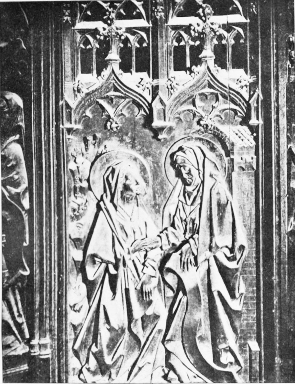 The glory of the cathedral is its stained glass, which fills the innumerable windows. Most of this is comparatively modern, and, though good in tone, is inferior to the fifteenth-century glass still existing in the windows of the Capilla Mayor, the Capilla de Santiago, and the north transept. The three rows of windows reach high up to the vaultings of the roof, those of the chapels being of two lights, those of the clerestory of four. It is strange that with such exquisite examples of colouring before them, the restorers of the church should have had the bad taste to bedaub the arches of the aisles with ochre, and to whitewash the pillars and vaults, marking the stonework with red lines. We could well have spared,{20} moreover, the elaborate plateresque work in the choir, which, though good in itself, is dissonant from the general character of the building; and the Churrigueresque retablo of the Capilla Mayor, representing the Assumption of the Blessed Virgin. The sanctuary and choir, which in so many churches are the most interesting feature, are of quite secondary importance at Leon. The Capilla Mayor, however, contains the remains of San Froilan in two silver reliquaries of the Renaissance style, and the relics of two other bishops (Alvitas and Pelagius) in plain marble urns. The choir stalls date from the fifteenth century, and are well carved. The best work is seen in the panels behind the stalls, the subjects being the generation of Christ, the Visitation, the Revolt of Satan, and the Descent into Hell.