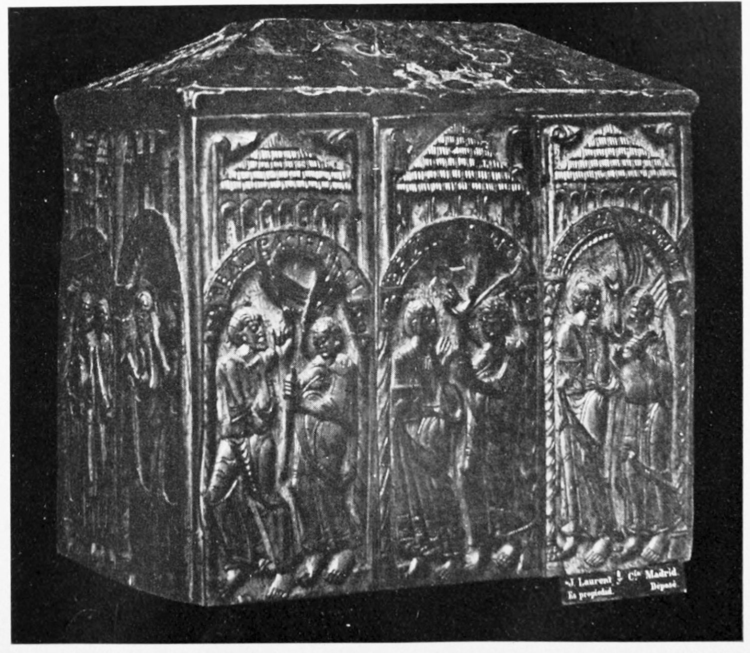 The arches of this gloomy Pantheon are decorated with curious frescoes, probably of the twelfth century. The crude drawing and tints rather add to the impressive effect of these solemn paintings. Among the subjects are the ‘Massacre of the Innocents,’ the ‘Last Supper’ (painted, as Street points out, without the least regard to the angles formed by the groining, and as if the vault were a flat surface), scenes from the Passion, and the Visions of the Apocalypse—terrible conceptions. One of the designs represents the Supreme Judge with two swords issuing from His mouth; another shows a hand, inscribed Dextra Dei. The compositions are surrounded by foliage, rich and conventional. On the altar is an interesting ivory cross, the gift of Fernando I. and Sancha, whose names are engraved upon the reverse. While the figure of Christ is rude in the extreme, the foliage and figures of the four evangelists at the back are exquisitely chiselled.{12}