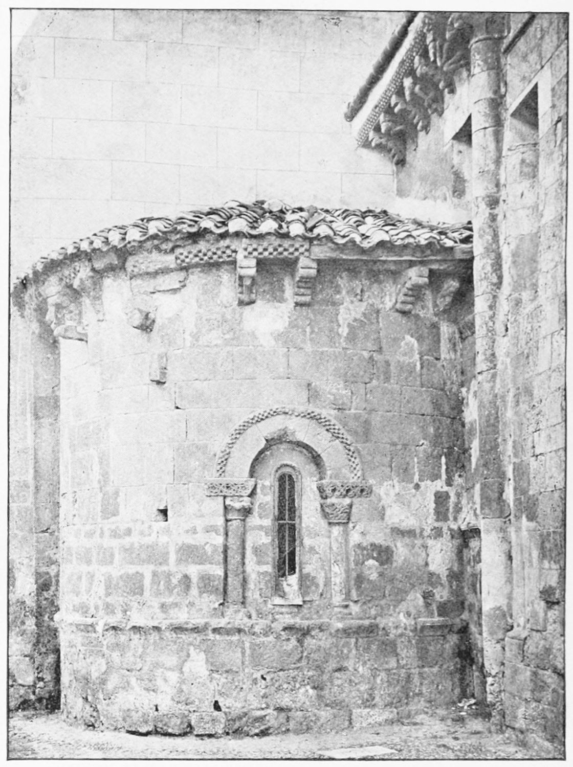 Leaving this place consecrated to wrath and tears, we re-enter the church. The plan is roughly cruciform, an apsidal chapel projecting to the east of each arm of the transept, on either side of the Capilla Mayor. We are now in that part of the fabric which was built by order of Alfonso VII., evidently on the model of St. Sernin at Toulouse. The name of the architect is given on an inscription in the flooring as Petrus de Deo—Peter of God. The most interesting features in the church are the very ancient mural paintings in the Byzantine style, with the same profusion of foliage and richly moulded capitals to be noticed in the Pantheon. The dentated and horse-shoe arches reveal traces of Moorish influence, showing that even in the far north of Spain architects could not have closed their eyes and ears altogether to the doings of the detested infidels.