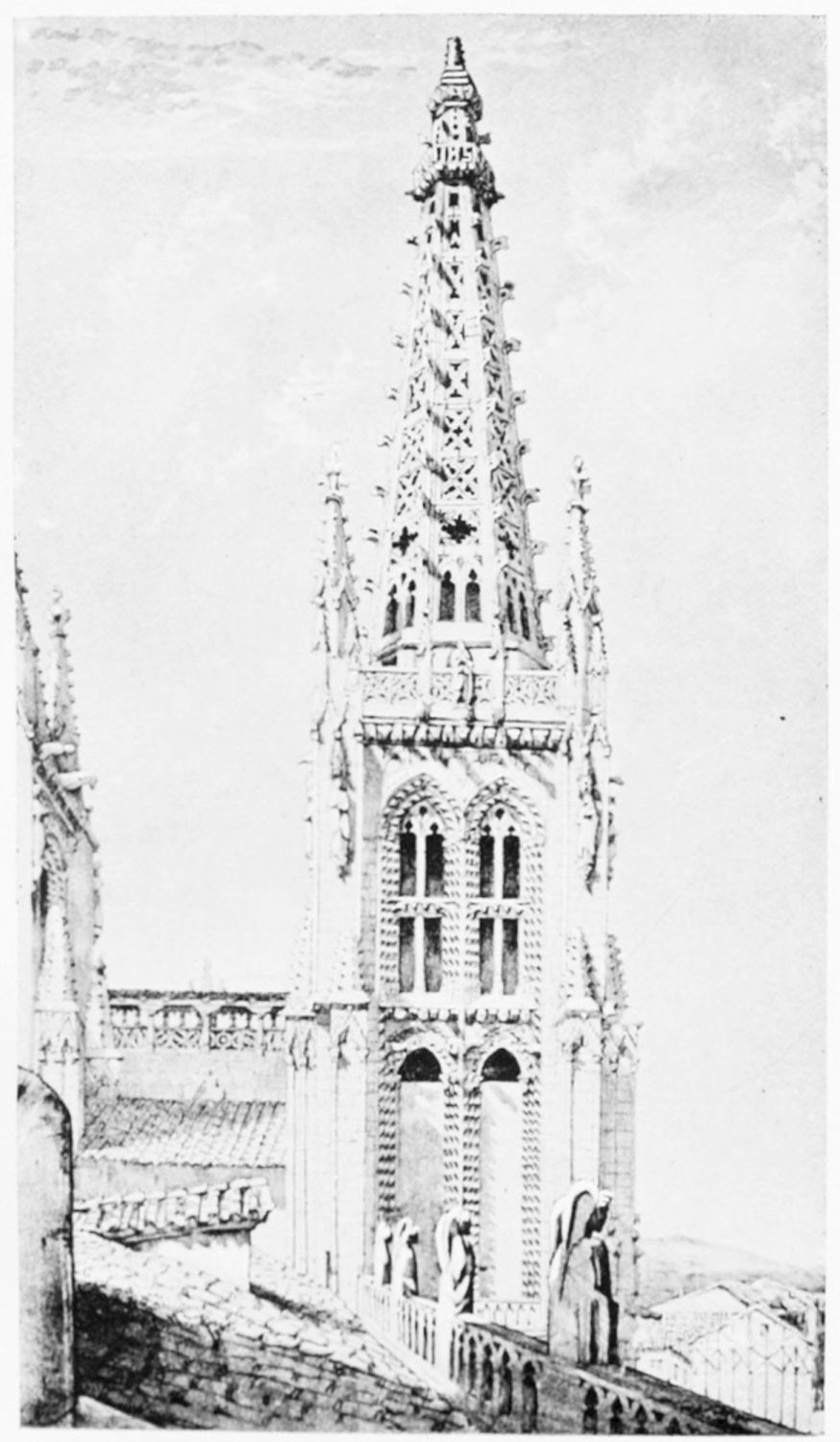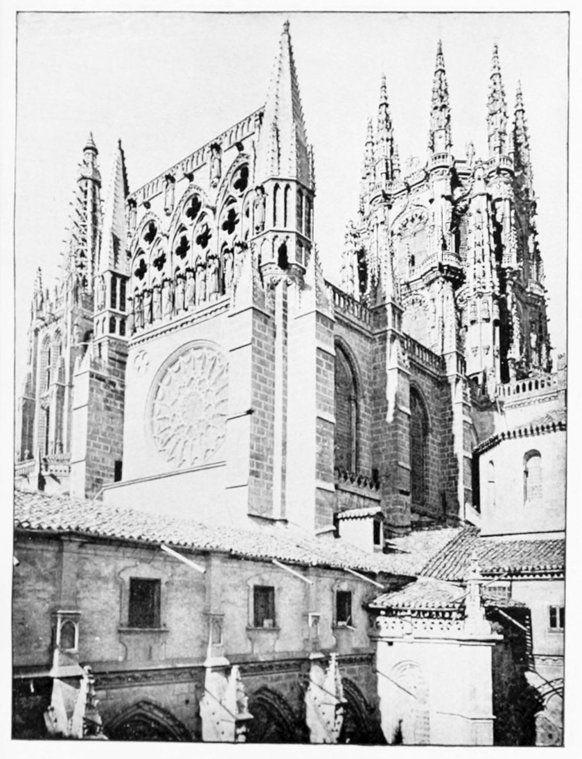The eastern end, or chevet, projects beyond the city wall, which forms the eastern boundary of the adjacent cloister. The transept, if that term may be applied to the whole space between the Capilla Mayor and Coro, is of unusual breadth, and may be said to include a nave, two aisles to the east and{17} one to the west. North and south it projects but slightly beyond the nave. The west front is flanked by two steeples, which stand on each side of, and do not terminate, the aisles. They are heavier than the rest of the structure, and of different heights and ages. Ugly, too, is the empty space left between their side walls and those of the clerestory over the main entrance. The northern steeple is the older, lower, and simpler; it is surmounted by a spire with a vane. The other tower is more ornate, and contains the belfry. Its traceries are in a debased Gothic style.