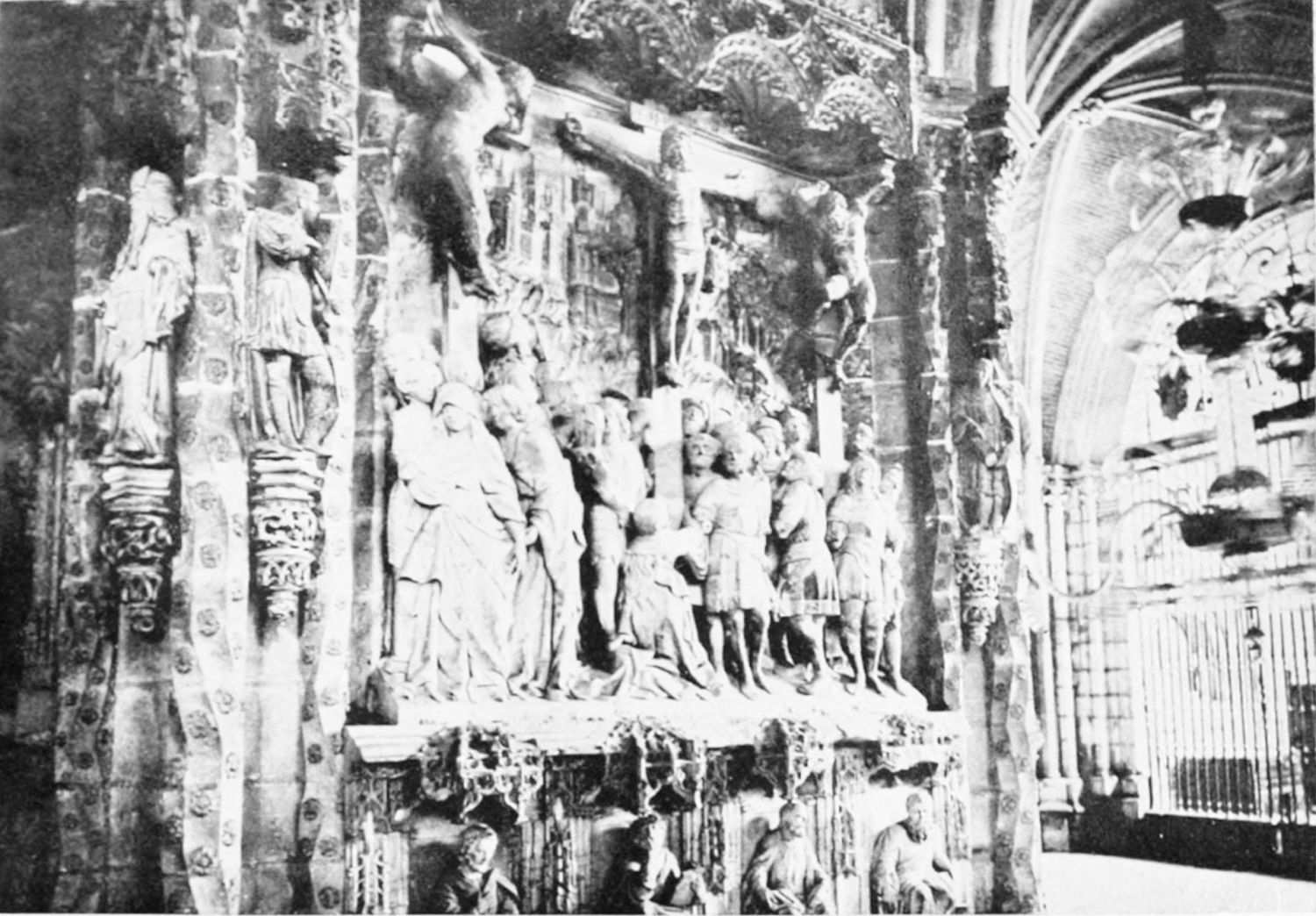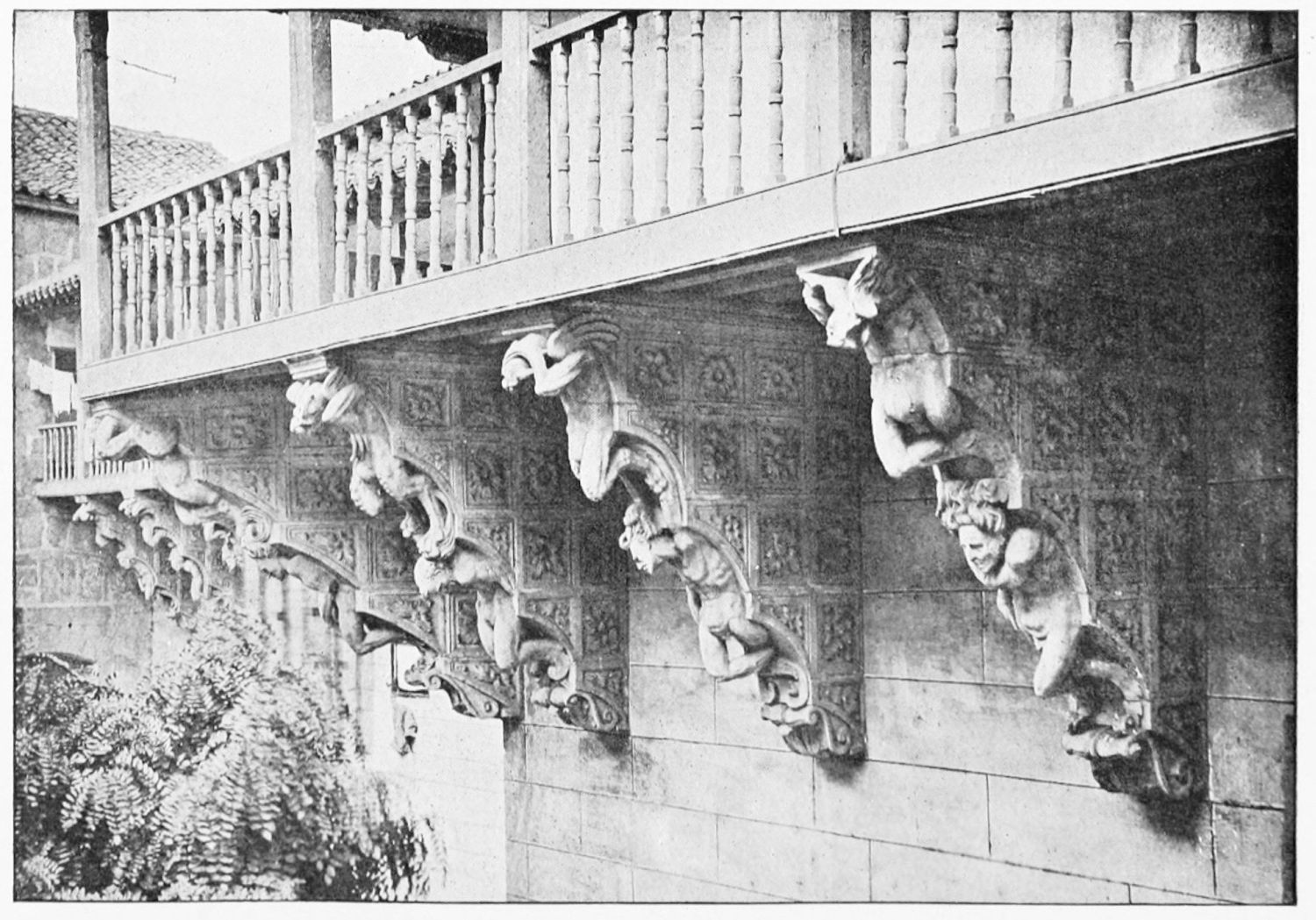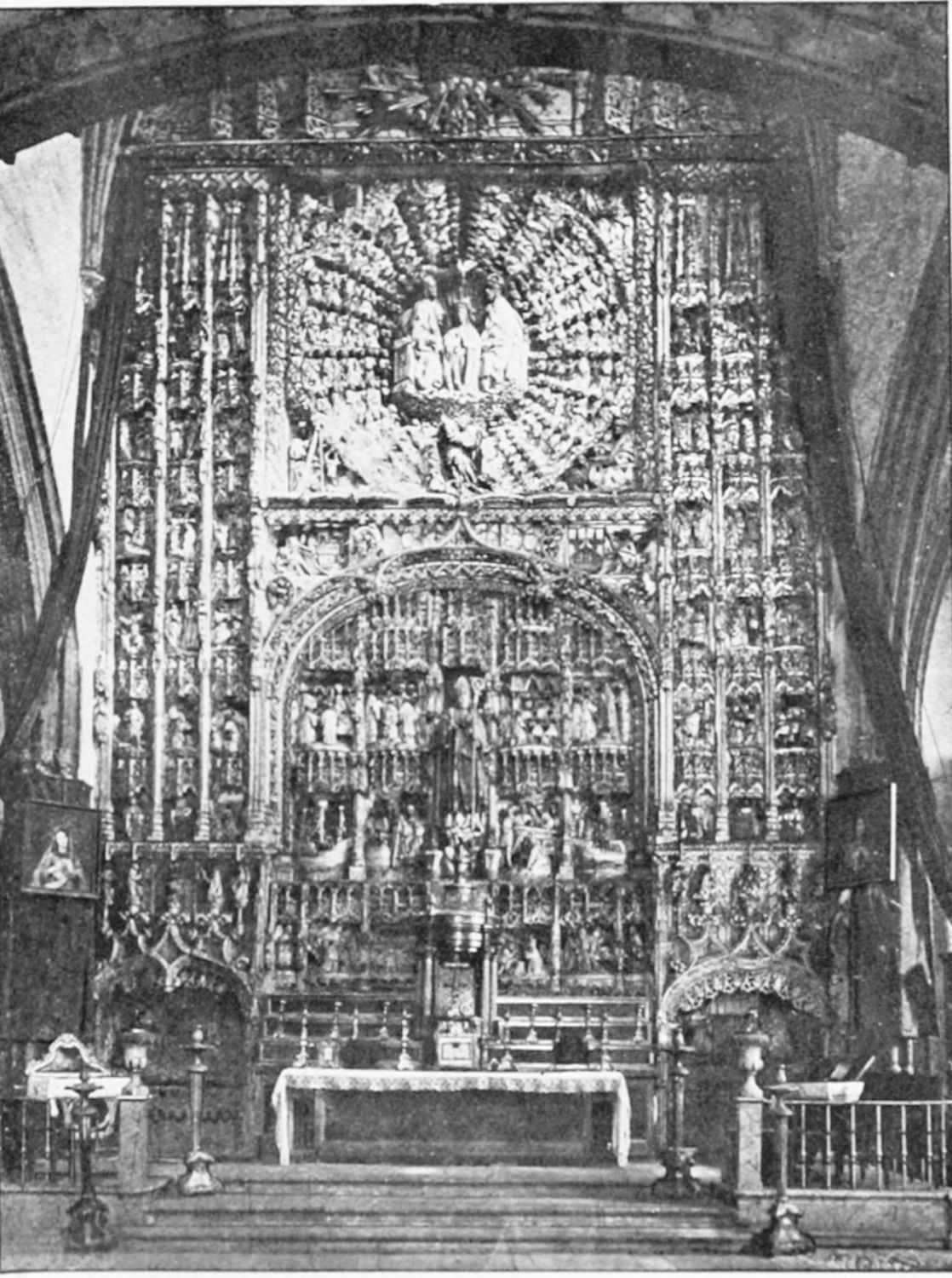 At the north-eastern shoulder of the church, between it and the tower in the city wall already mentioned, is the fine rectangular chapel of Santiago, built in the time of the Catholic sovereigns—on the site, it would seem, of a{23} twelfth-century chapel. The pillars are borne on the shoulders of various figures, among them being Samson, the Queen of Sheba, Laocoon, and a monk with a book on which is the derisive motto legere et non intelligere. The details of the architecture are capricious and graceful. The chapel is lighted by colossal windows, filled with gorgeous stained glass—blue and gold, purple and emerald—the reflected colour producing a magical effect.