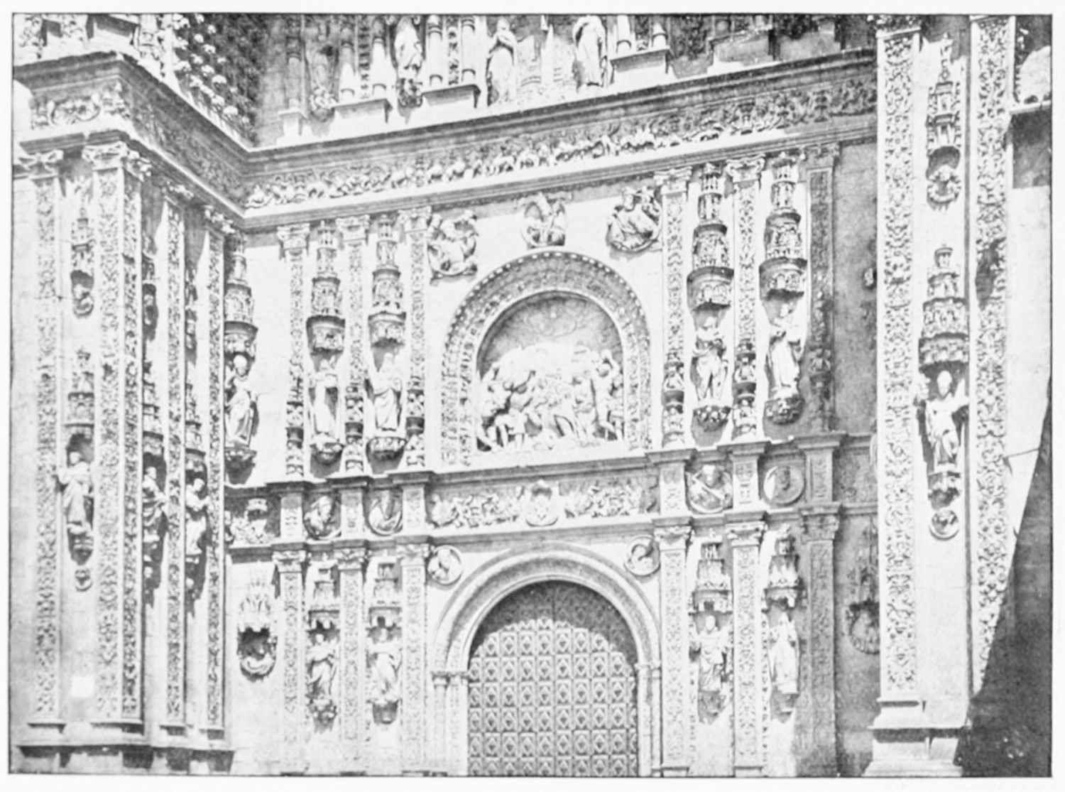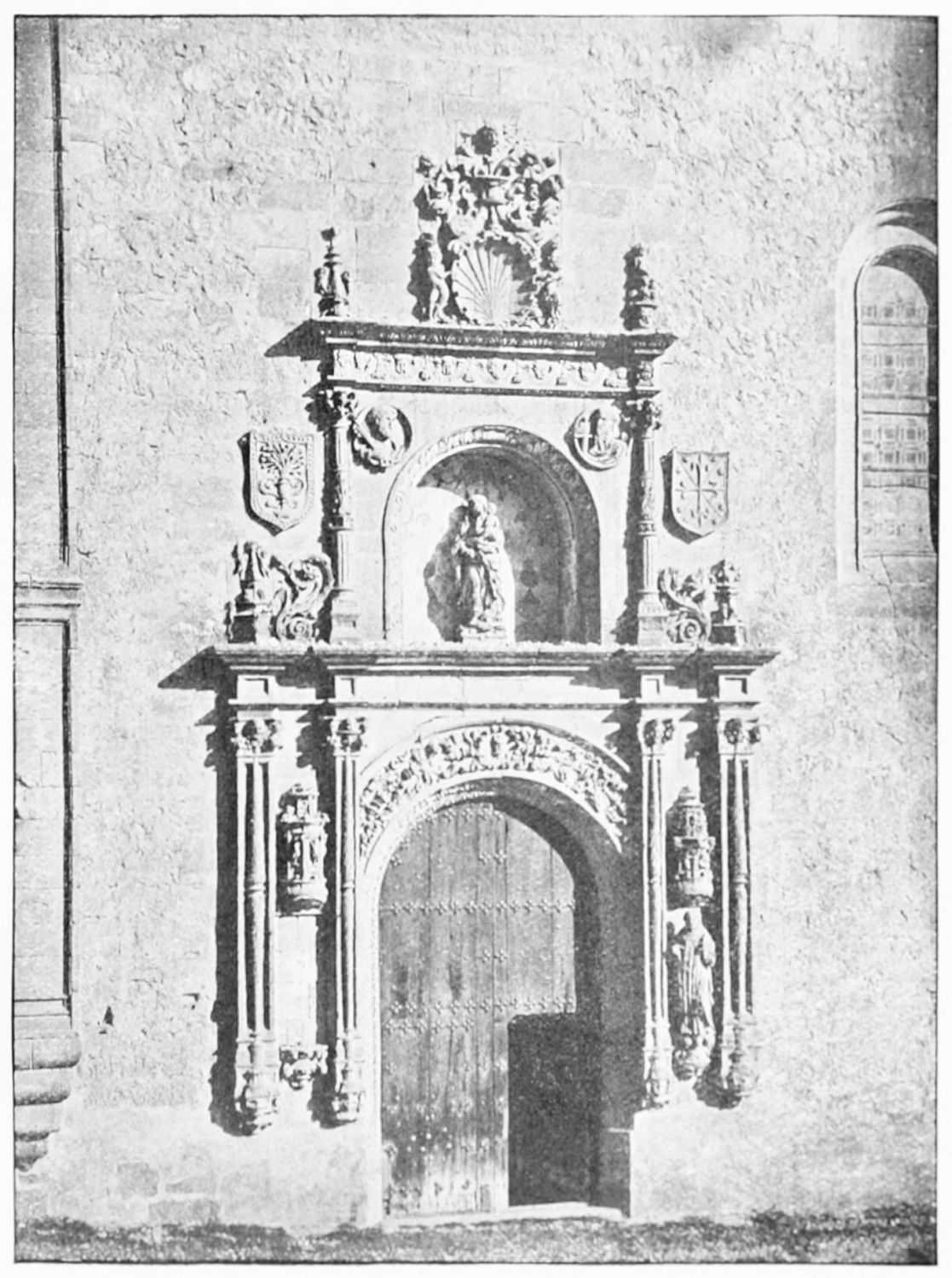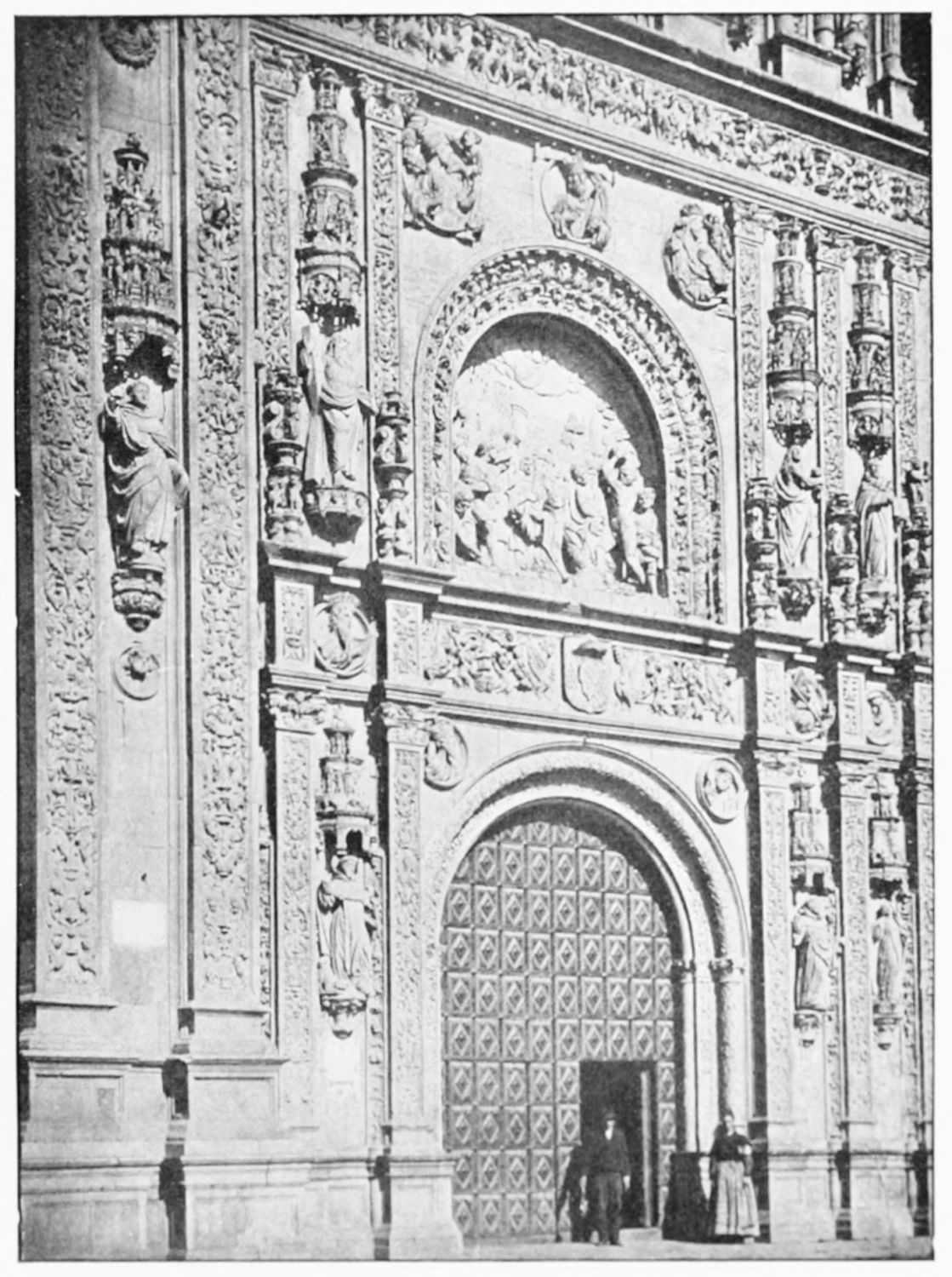 The Renaissance, which left everywhere in Spain so deep an impress, did not leave untouched this Gothic capital. Beside such triumphs of the Romanesque and pointed styles as San Isidoro and the pulchra Leonina rises the church of San Marcos, an interesting specimen of the newer school. Founded as a chapel of the new order of Santiago in 1170, the church witnessed the election of the first prior, and received in 1184 the ashes of the first grand master, Pedro Fernandez de Fuente Encalada. Fernando the Catholic ordered the church to be rebuilt in 1514,{26} but the work progressed very slowly and was not actually finished till 1715. The most important part of the fabric and the plans, however, we owe to Juan de Badajoz, who was working here about 1550. With the adjoining convent, first a hospice for pilgrims to Compostela, now the Provincial Museum, the building presents a very imposing appearance. The church occupies the eastern side of the block, the portal being contained within a very deep and lofty semicircular arch. On either side, in deep plateresque niches, are fine but damaged reliefs by Crozec. The ‘acroterium’ (to employ an expression used by Spanish writers), surmounting the arch, appears to be unfinished, as also are the towers or large buttresses flanking the portal.