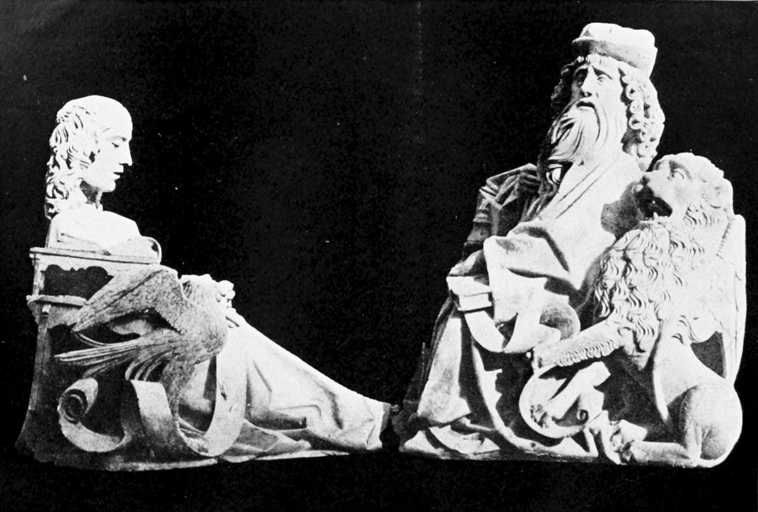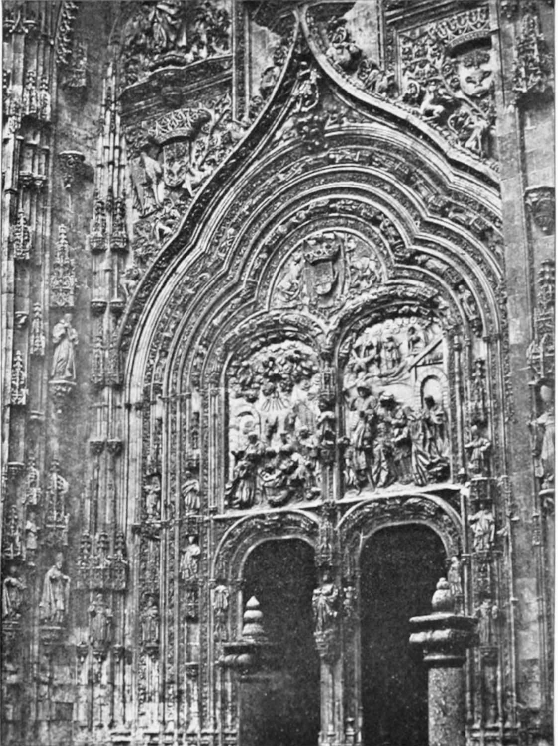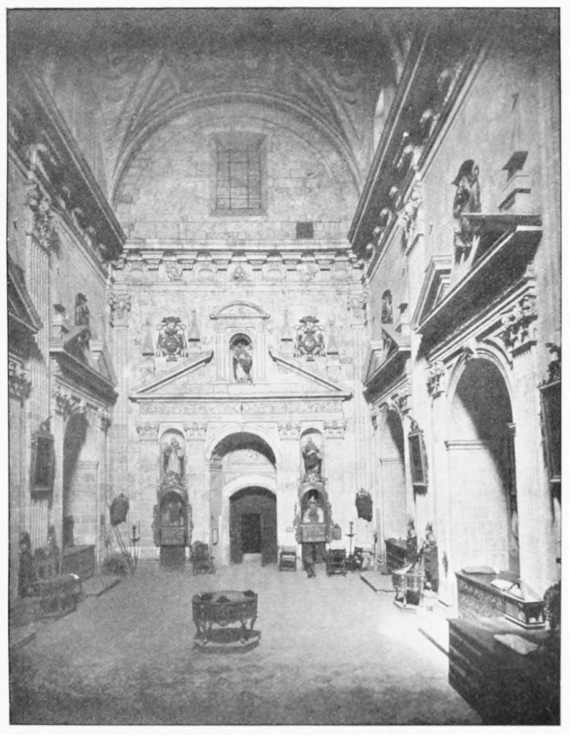 The Renaissance, which left everywhere in Spain so deep an impress, did not leave untouched this Gothic capital. Beside such triumphs of the Romanesque and pointed styles as San Isidoro and the pulchra Leonina rises the church of San Marcos, an interesting specimen of the newer school. Founded as a chapel of the new order of Santiago in 1170, the church witnessed the election of the first prior, and received in 1184 the ashes of the first grand master, Pedro Fernandez de Fuente Encalada. Fernando the Catholic ordered the church to be rebuilt in 1514,{26} but the work progressed very slowly and was not actually finished till 1715. The most important part of the fabric and the plans, however, we owe to Juan de Badajoz, who was working here about 1550. With the adjoining convent, first a hospice for pilgrims to Compostela, now the Provincial Museum, the building presents a very imposing appearance. The church occupies the eastern side of the block, the portal being contained within a very deep and lofty semicircular arch. On either side, in deep plateresque niches, are fine but damaged reliefs by Crozec. The ‘acroterium’ (to employ an expression used by Spanish writers), surmounting the arch, appears to be unfinished, as also are the towers or large buttresses flanking the portal.