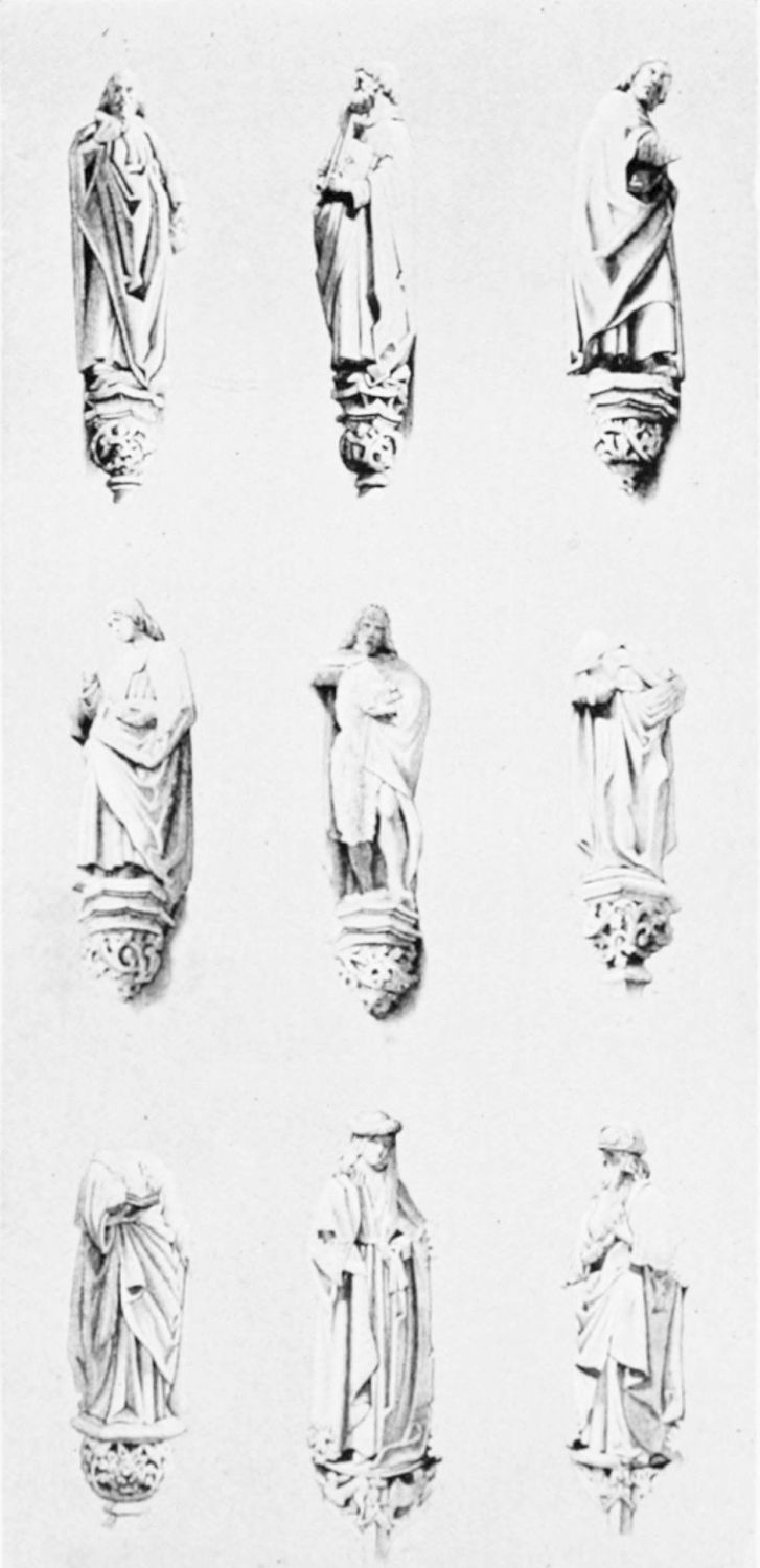 The façade between these steeples is very beautiful. It is surmounted by a pediment with ‘acroteria’ or pedestals to receive statues. Beneath this is a very large wheel-window above a row of windows corresponding to the triforium. The three magnificently sculptured doorways extend from steeple to steeple. The arches are pointed and triple. Byzantine influence is visible in the statuary and foliage. The figures, forty in number, are rather more than life-size, and represent saints and apostles, martyrs and confessors, kings and queens. On the north-west doorway is seen the half-defaced figure of Justice, bearing a sword inscribed with the words ‘Justitia est unicuique dare quod suum est.’ Beneath this{18} portal cases of appeal were tried in the thirteenth century. A small column between this and the central doorway is engraved with the words locus appellationis and the arms of Leon and Castile. The tympanum of the arch is adorned with reliefs, illustrating the earlier episodes in the life of Jesus. The doors themselves show scenes from the Passion and Risen Life.