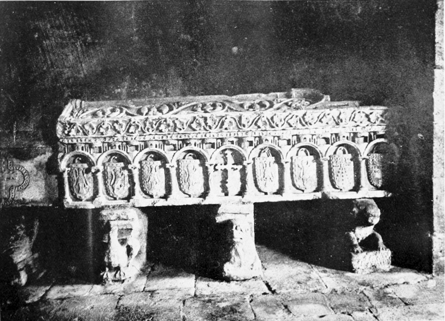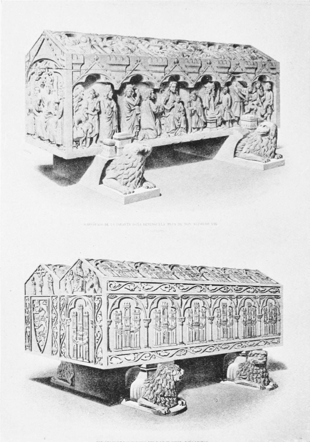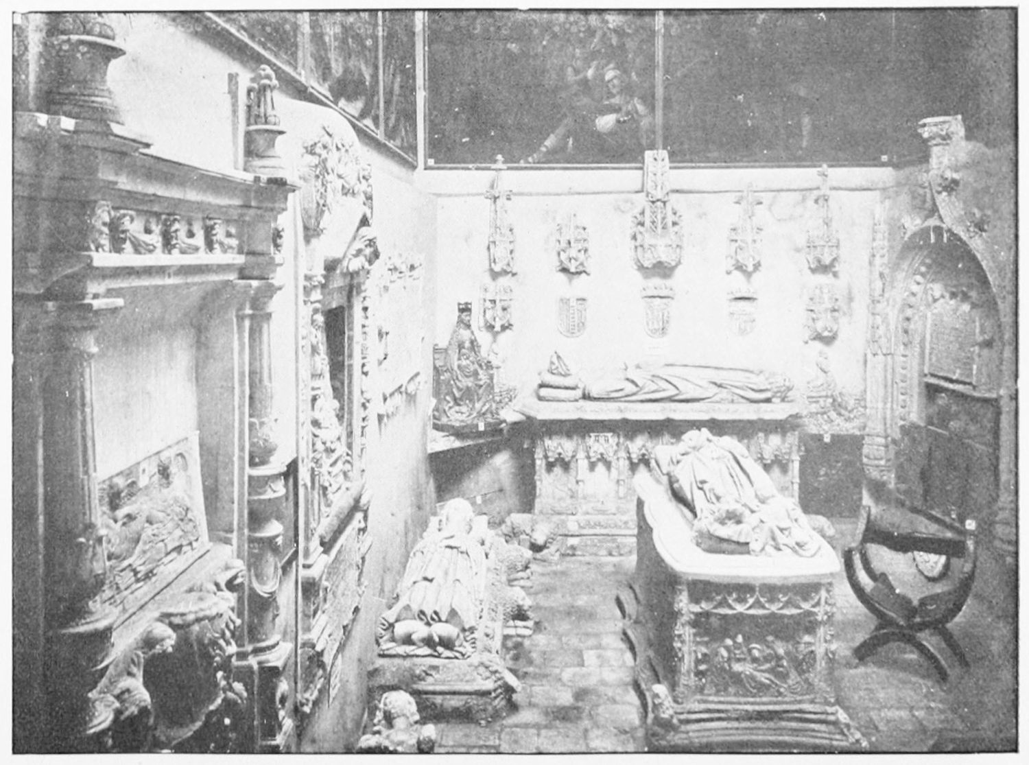The church is in the Romanesque style, the oldest portion being the chapel of Santa Catalina, which Street thinks was the original fabric of Fernando I. The chapel was intended as a mausoleum for the royal family of Leon, but twelve tombs only remain out of thirty. The only inscriptions are on the resting-places of Alfonso V. and Sancha, the sister of Alfonso VII. Here were buried Alfonso IV., Ramiro II., Ordoño III. and his queen, Sancho I., Ramiro III. and his queen Urraca, Fernando I. and Queen Sancha, Sancho the Great of Navarre, and the murdered Count Garcia. Here, before the Pantheon was despoiled by the French in{11} 1808, might have been seen the marble and porphyry sepulchre of the brave princess Urraca of Zamora, and the urns of the Moorish and French wives of Alfonso VII. Now, the inscriptions having been wantonly defaced, it is impossible to identify the few remaining sarcophagi.