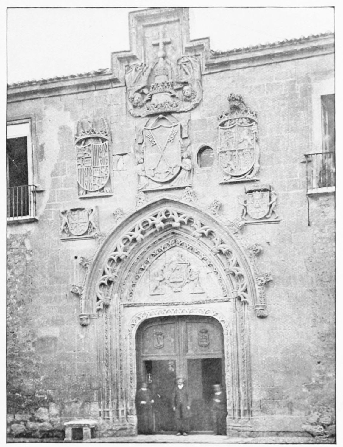 The grand façade of the old convent, extending to the river bank, is divided into two stories, the lower characterised by semicircular windows between pilasters in the plateresque style, and separated by niches; the upper by rectangular windows with balconies, disposed between columns, and likewise separated by niches in pairs. The frieze beneath the lower row of windows is adorned by a series of medallions, displaying the heads of mythological and historical worthies, Gentiles and Christians, ancients and moderns, most oddly assorted. With Priam and Hector, Hannibal and Cæsar, we find Charlemagne and the Cid, Charles V. and Philip II., with Lucretia, Judith and Isabel the Catholic. The busts to the left of the doorway are those of the grand masters of the Order of Santiago. The{29} doorway itself is a very unhappy combination of the plateresque and baroque styles, but the statue of Fame surmounting it is not devoid of grace and dignity. The balconies and windows facing the river date from the eighteenth century.
