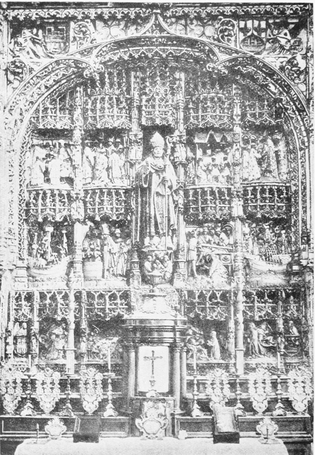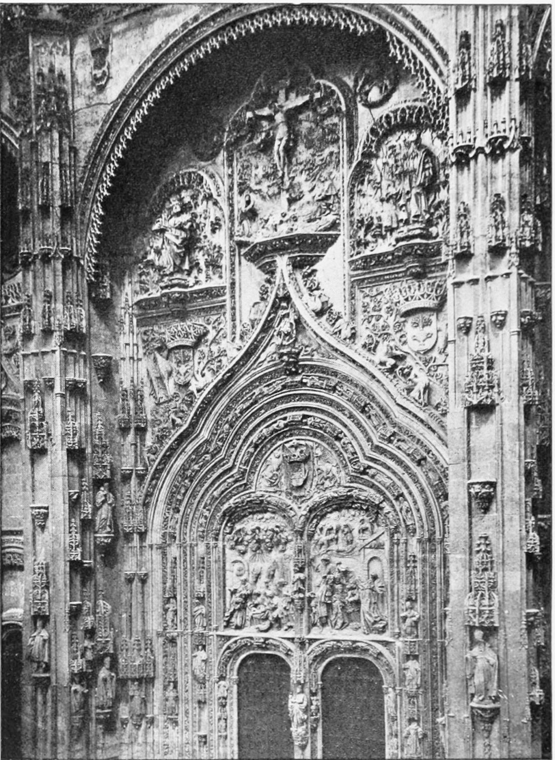 The beauty of this wonderful church consists largely in its lightness. Its supports are so slender, its walls so freely pierced with windows at every stage, its details everywhere so delicate, that the term ‘frozen music’ applied to architecture seems here indeed no mere hyperbole. ‘A mere lantern,’ Street calls the church, and blames the architect for his extreme daring and for his excessive use of windows. Though the vaults had been filled in with very light stone or concrete, the fabric was ever trembling on its fragile foundations. In 1631 the vault above the crossing collapsed, and was replaced by a dome. A hundred years later many of the arches of the aisles succumbed. Meanwhile Renaissance and Churrigueresque additions were made; but the whole was restored between the years 1850 and 1901, and now the cathedral exists in almost pristine symmetry and airiness.