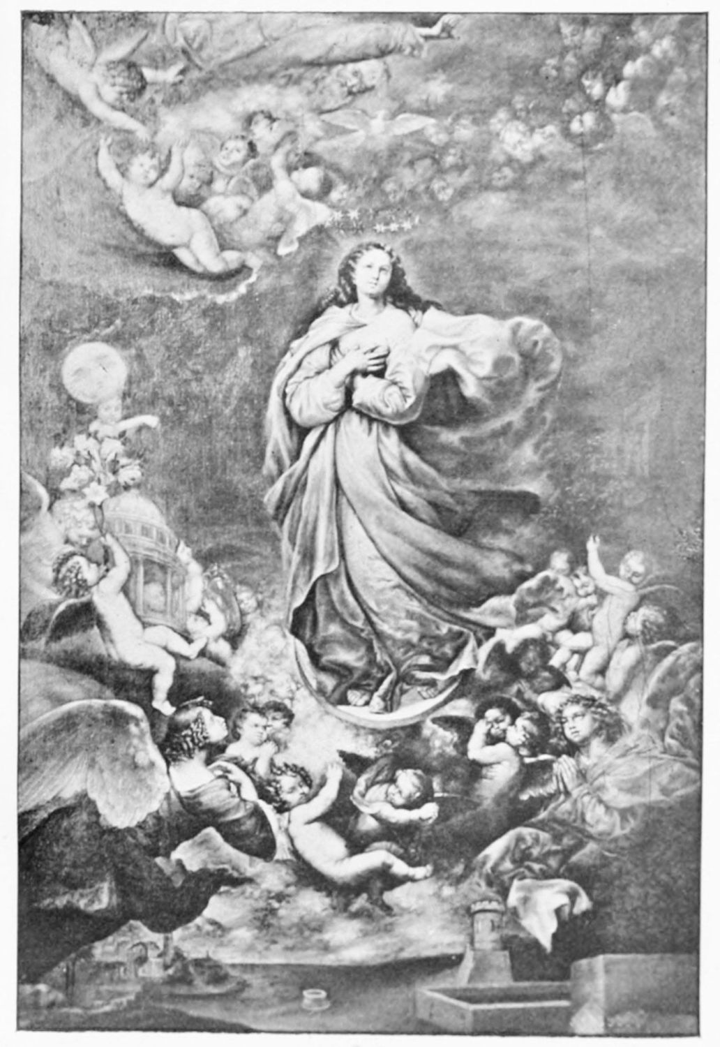 The spacious cloister, which conceals the northern façade of the cathedral, was built in the early fourteenth century, but it has been rebuilt, restored, and altered into what Street calls ‘a very poor and weak kind of Renaissance.’ The ornamentation is profuse and not in bad taste. The inner walls have not been much altered, and the pillars supporting them are sculptured in the Gothic style. The bays are painted with an extremely valuable and interesting series of frescoes, so well drawn that they were more likely the work of some fifteenth-century Italian artist than productions of native talent. The subjects are all from the history of Christ and Mary, the Crucifixion curiously enough being omitted. When Street saw these paintings forty years ago, he spoke of the colours{24} as pure and good, but they have now been almost entirely obliterated by the damp. The cloister contains several sepulchral monuments, some mere slabs, but one—that of the Canon Juan de Grajal (1447)—elaborately and artistically sculptured. Some colossal idiot has cut off the heads of the angels shown in this fine piece of work. Near the beautiful Gothic entrance to the cloister is an image of our Lady of Regla, to which at one time the people used to proceed in procession to return thanks for the mythical victory of Clavijo, a choir of damsels representing the equally mythical tribute of one hundred virgins said to have been paid by Mauregato to the Moors.
