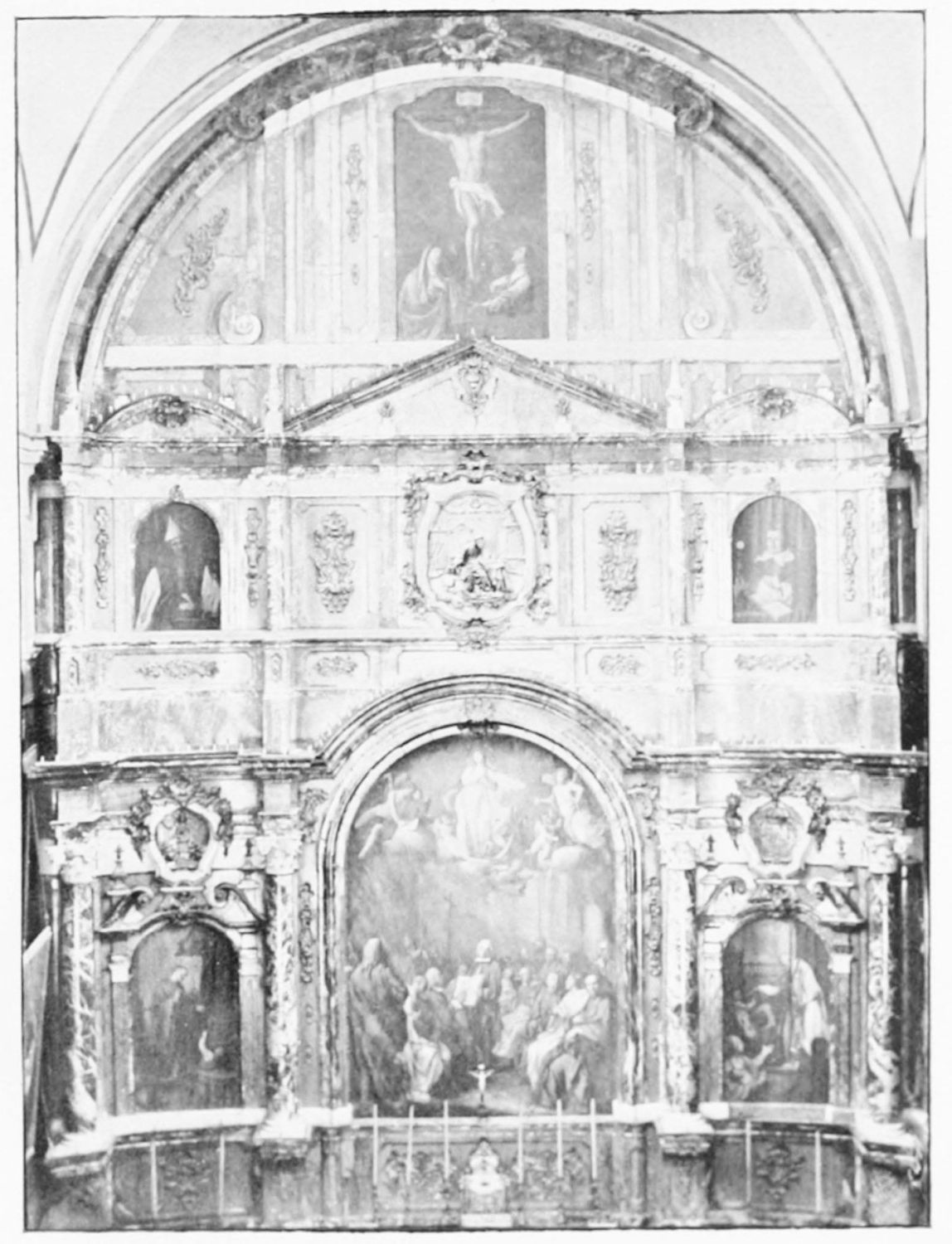 The work of Juan de Badajoz is to be seen in the Sacristy, a spacious nave of three vaults, richly designed and gilded. Under the windows are medallions with busts in relief, very well done. The retablo in the plateresque style shows the Eternal Father with His angels, and the Vision of Santiago. The inscriptions on the frieze are from the Book of Leviticus.