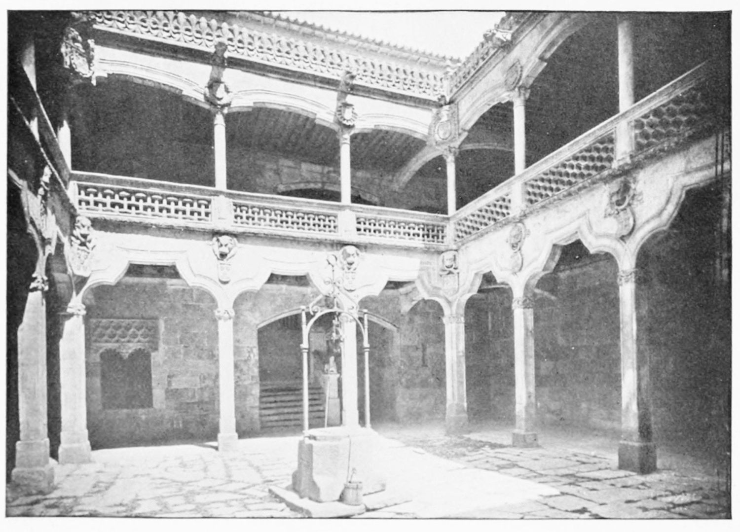 A good deal of building went on in Leon during the sixteenth century. In the Plaza de San Marcelo (before Alfonso XI.’s time, outside the walls) stands the mansion of the illustrious Guzman family, of which Guzman el Bueno, of Tarifa fame, was an illegitimate and the most distinguished member. It was built in the year 1560 by Juan Juiñones y Guzman, Bishop of Calahorra. Its architecture is severe and imposing. Over the main entrance, adjoining a square tower at the corner of the building, are two medallions on which is engraved the motto, ‘Ornanda est dignitas domo—non domo dignitas tota quærenda’—a device which one wishes all the architects of the age had borne in mind. The interior patio is adorned with handsome plateresque reliefs. Next to the Casa Guzman is the residence of the marquesses of Villasinta, in rather similar style. Beneath the sixteenth-century façade of the mansion of the great Luna family was discovered a fine Gothic arch, with{30} another pointed arch supported by columns with Byzantine capitals. This work cannot be later than the thirteenth century. In the patio is a magnificent arch designed with arabesques.