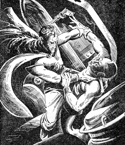 Hand near his gun, Ketrik emerged into a long empty corridor of black and silver. Black marble walls reached sheerly up, to curve away into a filigreed ceiling. Priceless tapestries adorned the walls, caught a hidden overhead glow and shattered it into lances of silver radiance. Ketrik frowned, looking at these tapestries. Their design was interwoven with thousands of Kra plumes, those priceless silvery plumes for which he'd risked his life many times among the wild peaks of Ganymede. Only the very elect could afford them. He knew now, that he must be in Earth's Council Chambers.