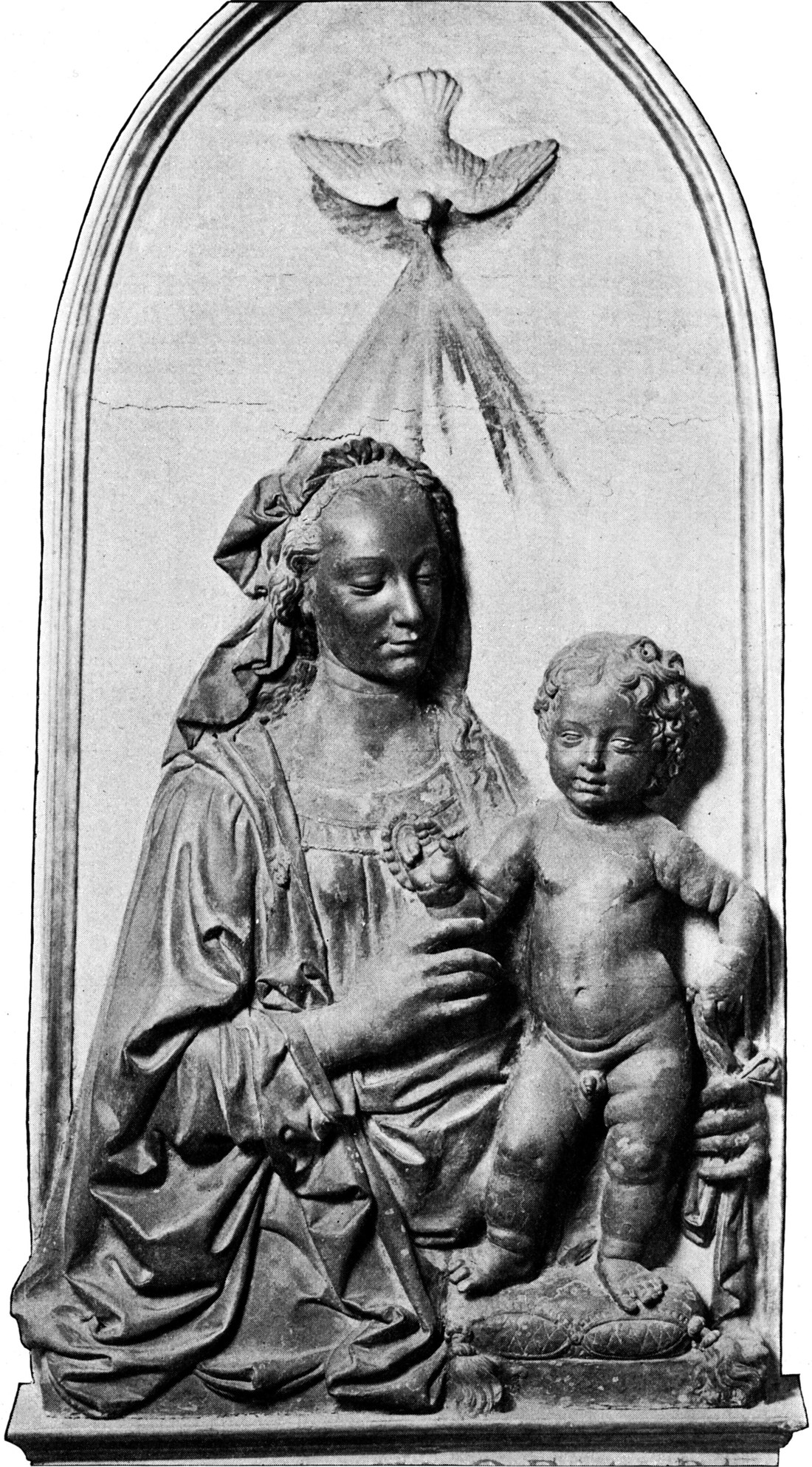 Maria, bis zu den Knieen sichtbar, sitzt in felsiger Landschaft mit dem Kinde auf dem Schoß, das die Ärmchen der Mutter entgegenstreckt. Dies Motiv ist schon von den plastischen Madonnen des Meisters her bekannt; nur ist das Kind hier auf dem Schoße der Mutter sitzend und unruhiger bewegt dargestellt. Im Kopf der Madonna finden wir alle Merkmale verrocchiesker Formengebung, auch das anmutig sich von den feinen Mundwinkeln her verbreitende Lächeln wird nicht vermißt. Das Christkind in seiner drallen Fülle ist dem Fischmännchen stammverwandt. Mit dem Reichtum seiner Überschneidungen und der Kühnheit seiner Verkürzungen legt dieser Kinderkörper von einer ebenso kundigen wie sorgfältigen Meisterhand Zeugnis ab.