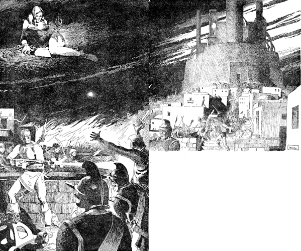 They went forward in a ravening wave of fury, the fury of roused fighting men, who had looked the eyeless sockets of Death's skull in the face and lived. The night held no more terrors for them for their nostrils were tasting the fragrance of victory. Other men came up from the Lower City to join them, men who bore home-made weapons, crude clubs and axes.
