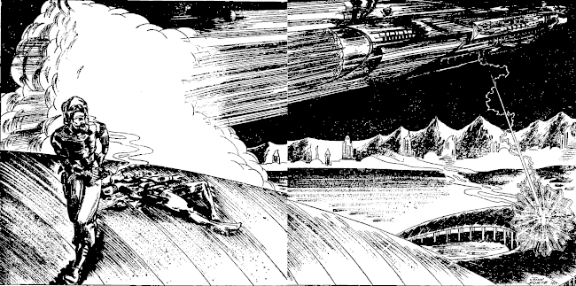 The night turned to crimson flame. Boom! A vast concussion shook the earth, the sky. Frederix fought the bucking controls. Behind, the spacestation's defenses were debris spouting into the upper air, and livid, leaping fire cast macabre patterns upon the distant vaults of Certagarni.