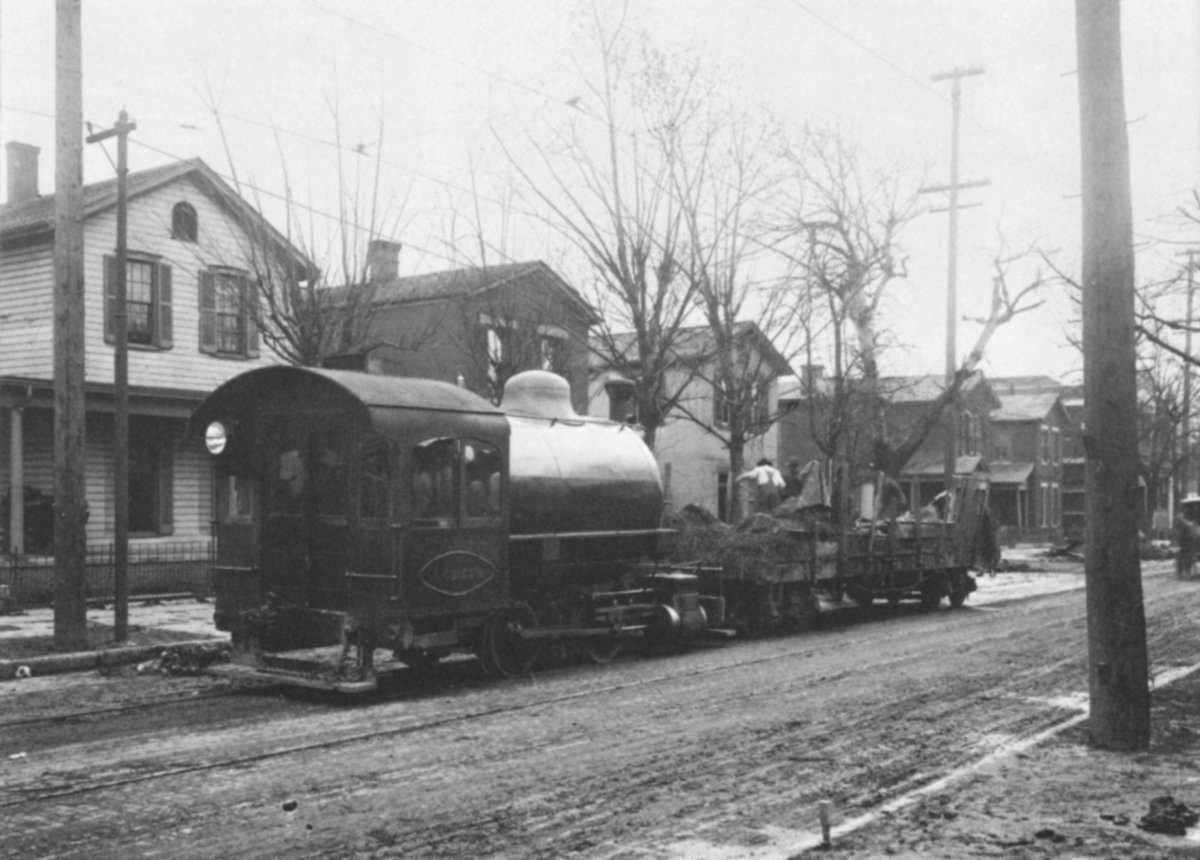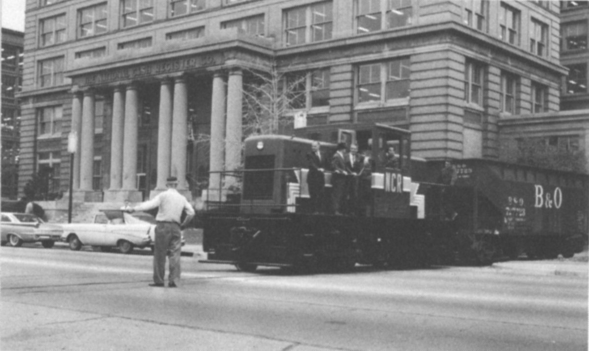 With several NCR employees aboard, the replacement engine makes its first run across Dayton’s South Main Street.