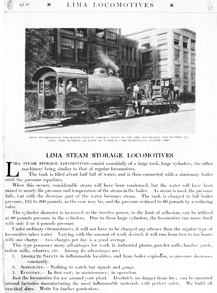 FIRST STEAM-STORAGE LOCOMOTIVE USED IN AMERICA BUILT BY LIMA LOCOMOTIVE AND MACHINE CO., LIMA, OHIO, WORKING AT PLANT OF NATIONAL CASH REGISTER CO., DAYTON, OHIO.