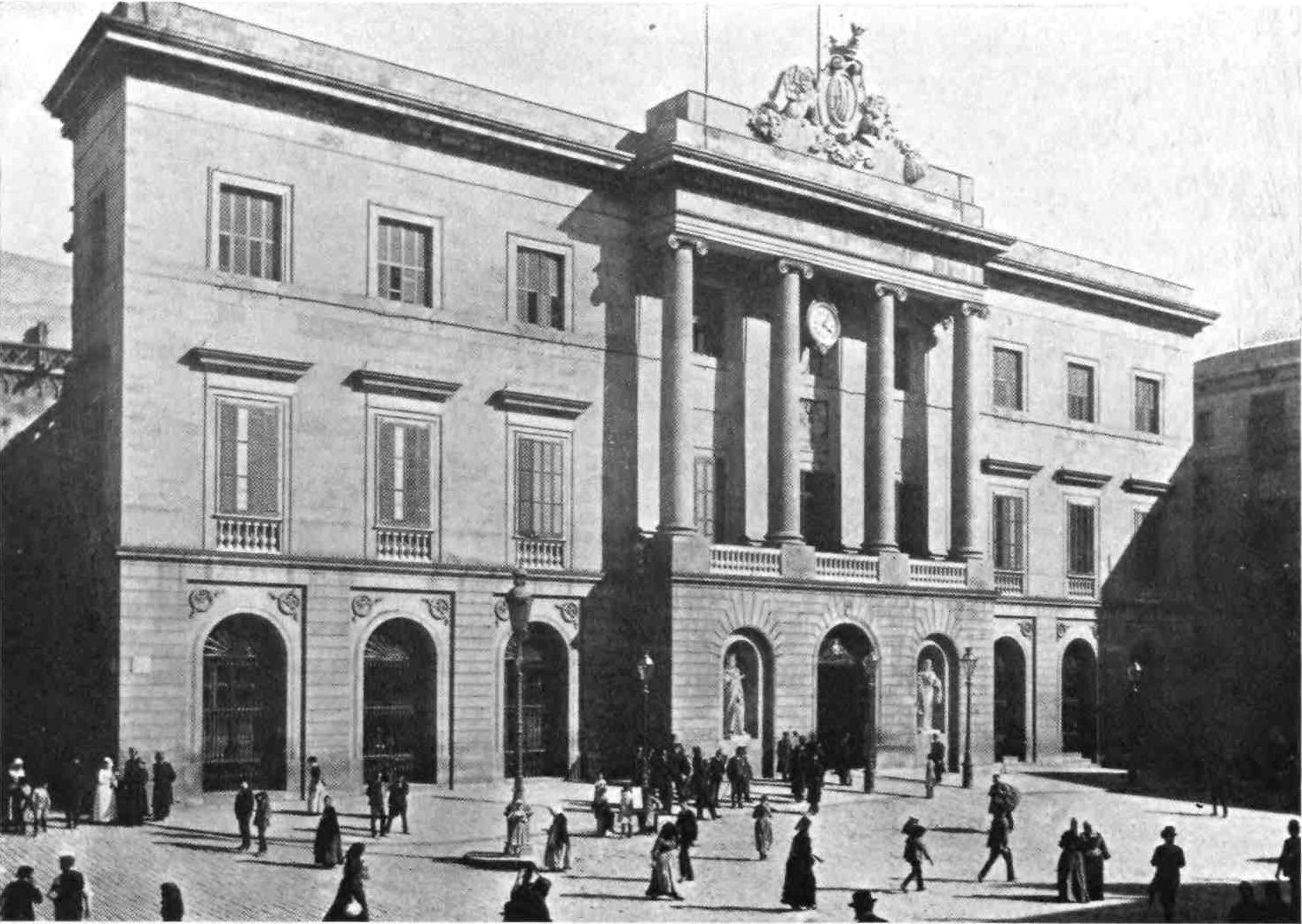 One instinctively searches at Barcelona for monuments of civic state befitting a city of such antiquity and dignity. Happily such are not lacking and have been preserved to us. The noble Gothic façade of the Town Hall (Casa Consistorial), erected in 1373, has been recently restored, fortunately with good taste. The Council Chamber (Salon de Ciento), formed of two bays which support an artesonado roof, is lined by a collection of portraits of Catalan worthies, among whom we distinguish Capmany, Villadomat and Montaner. A finer building and preserving more of its primitive character is the Diputacion, the old Parliament House of Catalonia, and now the seat of the Provincial Court. This monument, declares Piferrer, “is the admiration of foreigners and the honour of Barcelona. He who seeks for originality of style, let him examine all its parts and be convinced that many are of a character entirely new.” Built in the early fifteenth century, it underwent frequent restorations and enlargements, and was rebuilt in great part in 1609 by Maestre Pere Blai, who spared the best portions of the old work. The principal façade is cold and devoid of interest, except for the figure of St. George above{21} the entrance. To that saint is dedicated the chapel, with its fine ogival portal, and the adjoining wall damascened (to quote Piferrer) with reliefs. The chapel is the repository of an exquisite altar frontal, worked with the design of St. George and the Dragon, and designed by Antonio Sadarni, in 1458. The pillars sustaining the galleries of the patio, at one time much admired for their daring and ingenious execution, were bending and giving way under the strain till restored and strengthened a few years ago by Don Miguel Garriga y Roca, a local architect.